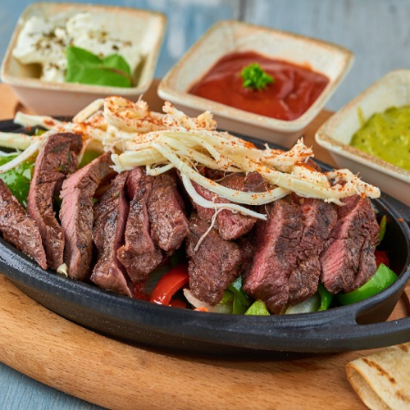 Arrachera en fajitas guacamole lechuga tomate cebolla asada y aderezo queso asadero gratinado.