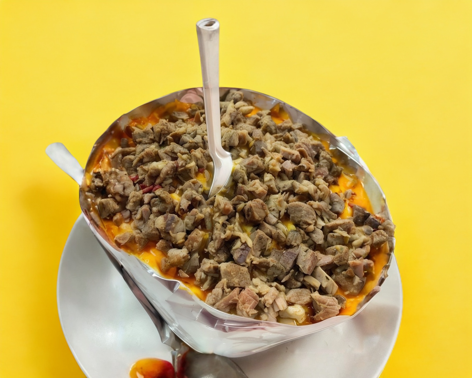 Deliciosa papa con carne de bistec, queso y aderezos acompañado con jalapeño salsas y galletas saladas.