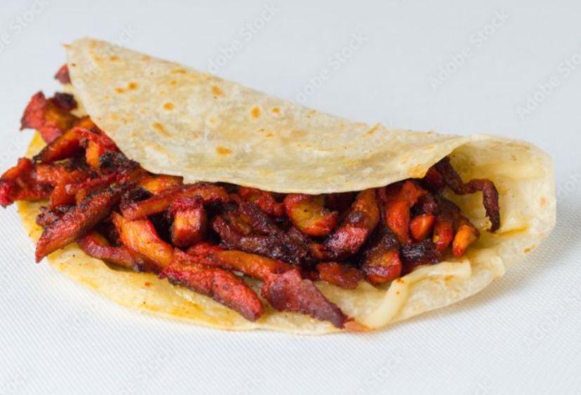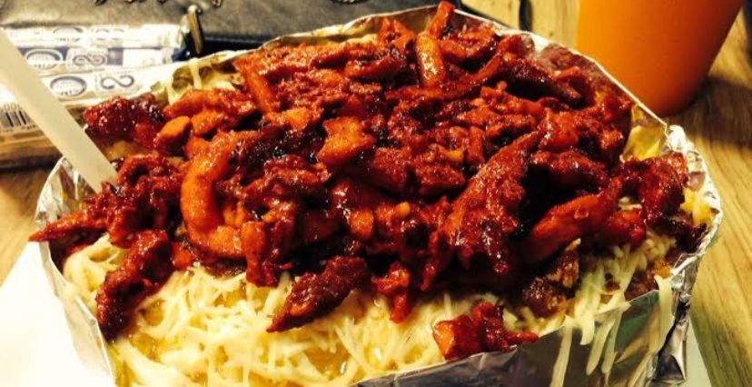 Con queso asadero y carne de bistec y trompo con aderezos y jalapeño también con galletas saladitas.