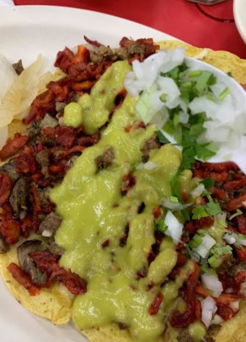 Deliciosa carne de suadero 100% carne de res, con sus deliciosas salsas, cebolla y cilantro con cebollita asada.