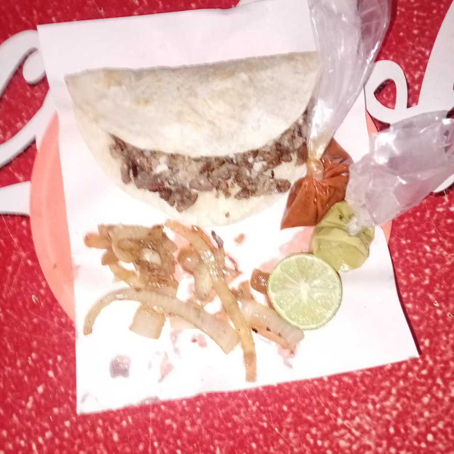 Tortilla de harina con queso y carne al pastor.