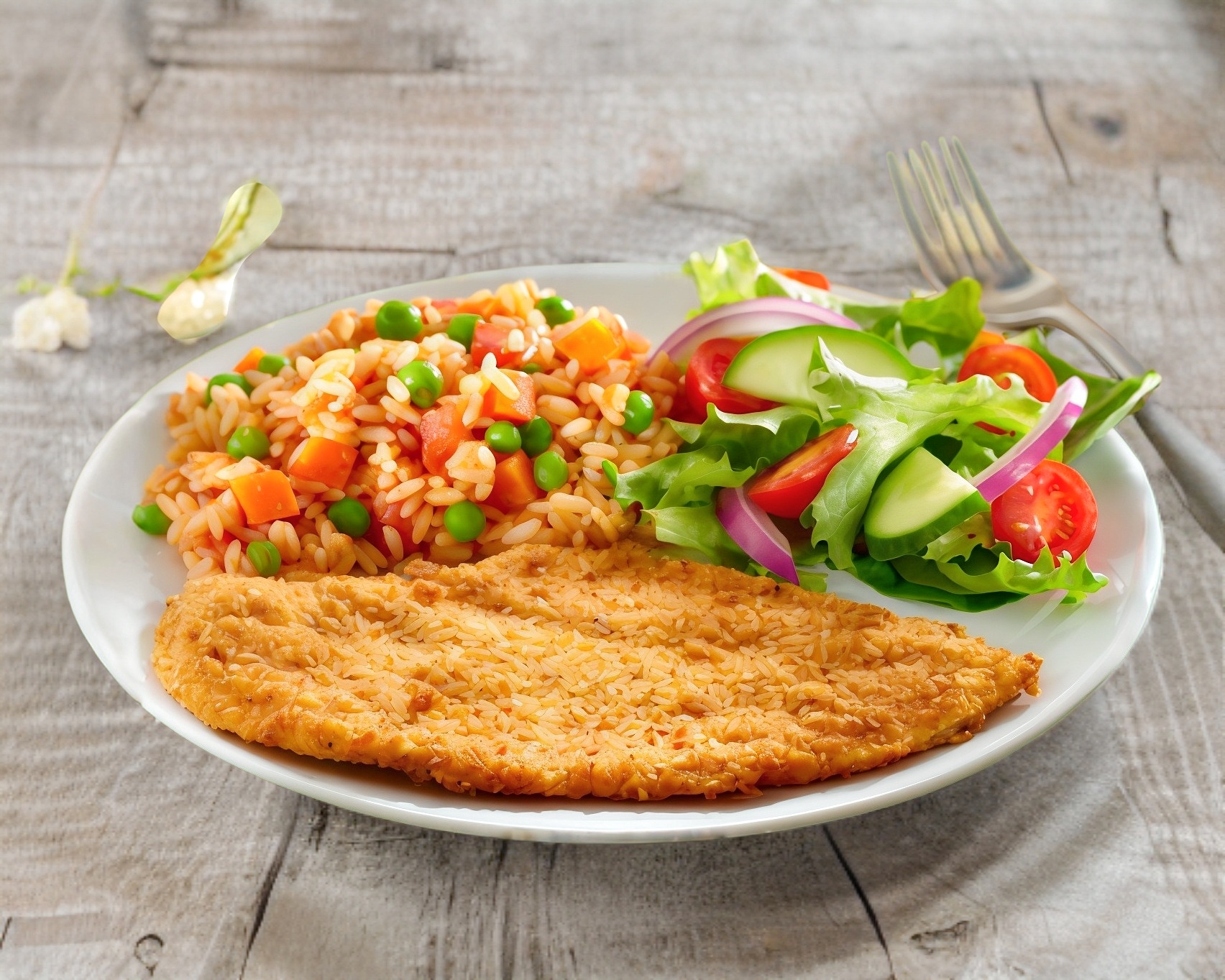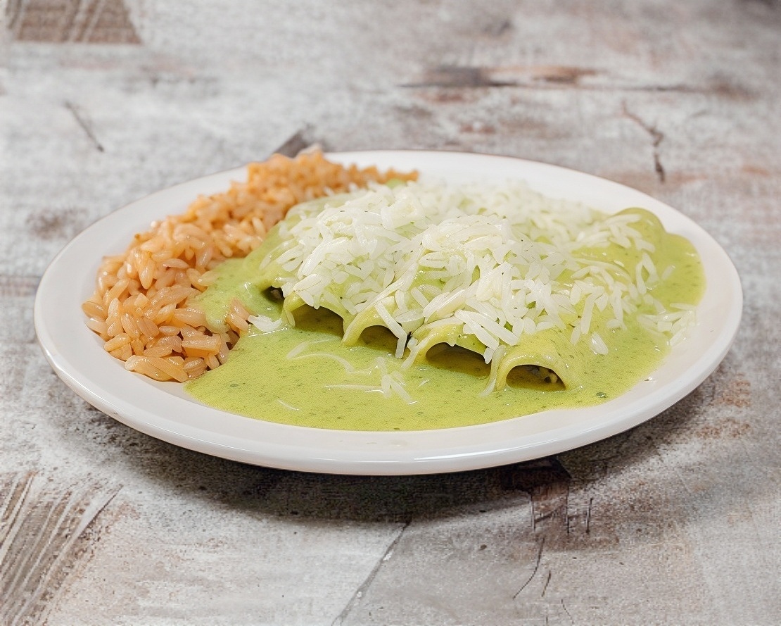 De pechuga de pollo especial (80Gr), bañadas en salsa verde (no pica) y crema, acompañadas de arroz (40 gramos ) y lechuga. y lleva queso gratinado