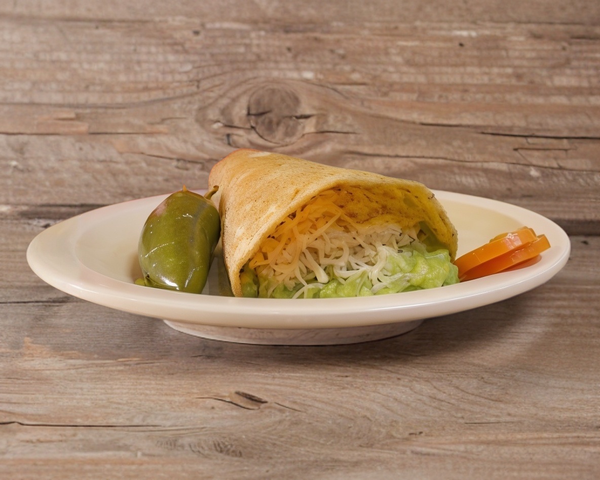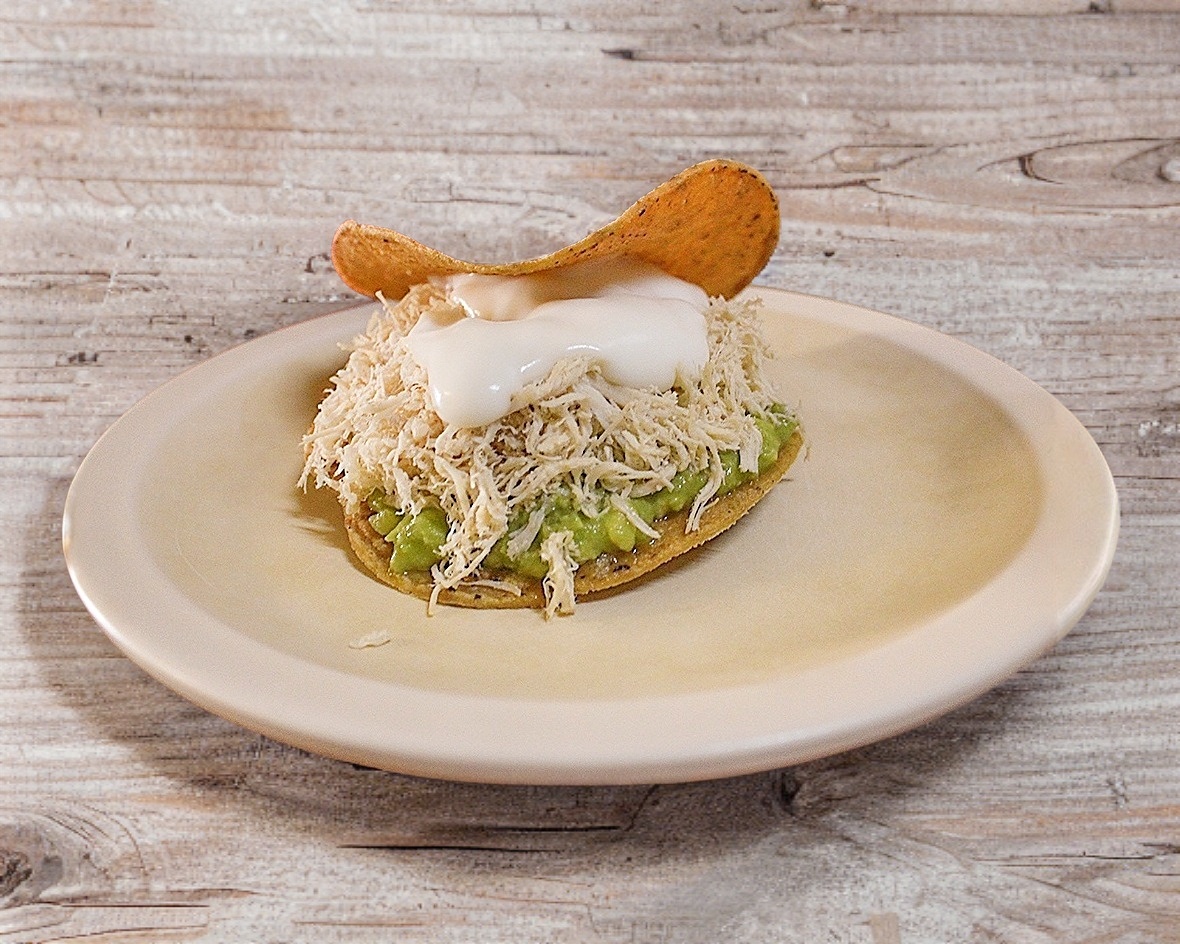 Taco de maíz blando con pechuga de pollo especial, guacamole y crema. Porción personal.