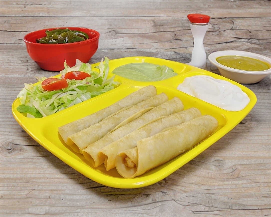 Flautas a base de harina de maiz 5 piezas. De pechuga de pollo (45 gramos)con guacamole y crema, acompañadas de arroz (40 gramos ) y lechuga y tomate salsa adicional