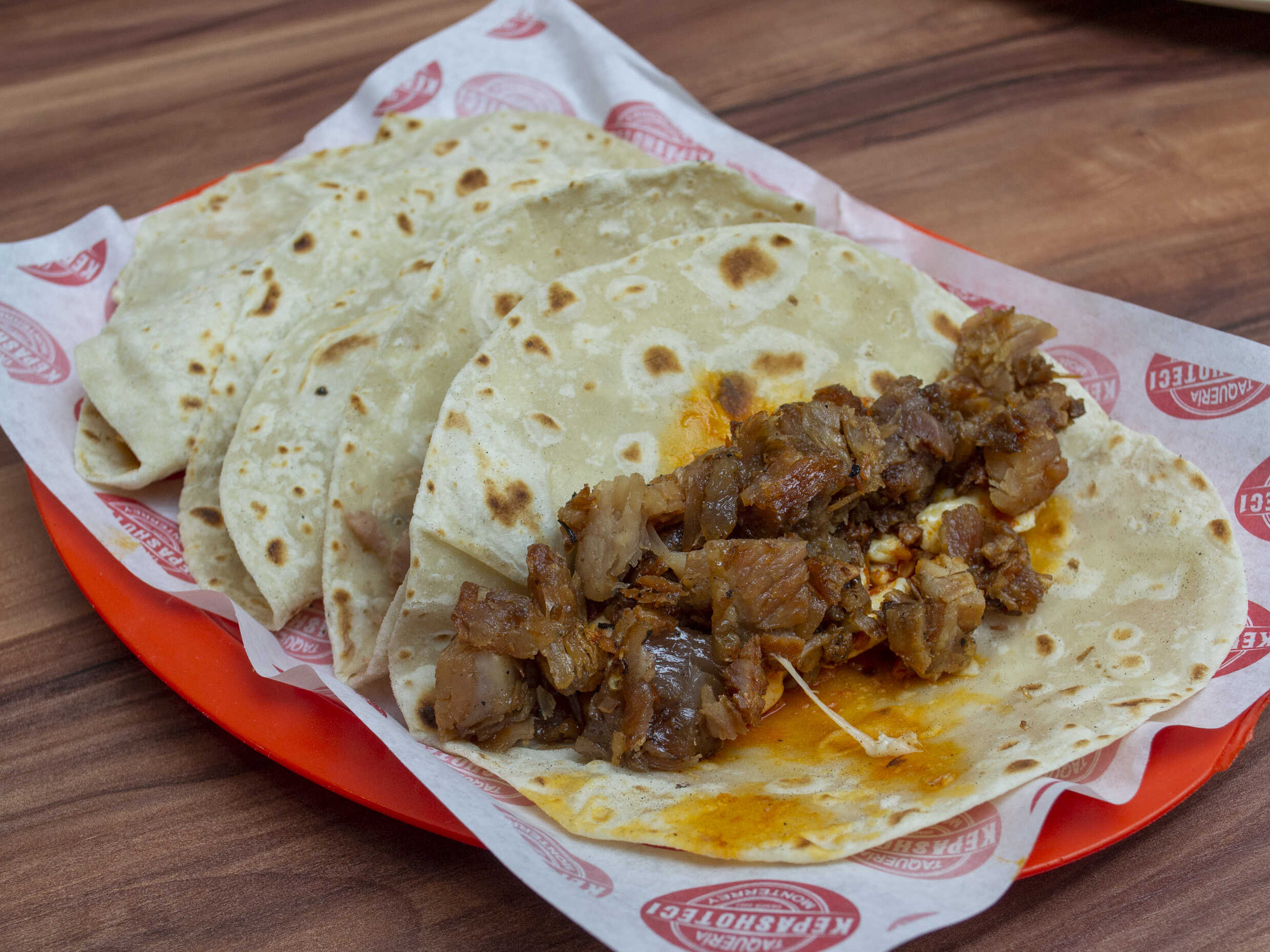 Salchicha polaca guisada con tocino, cebolla, tomate y queso gratinado