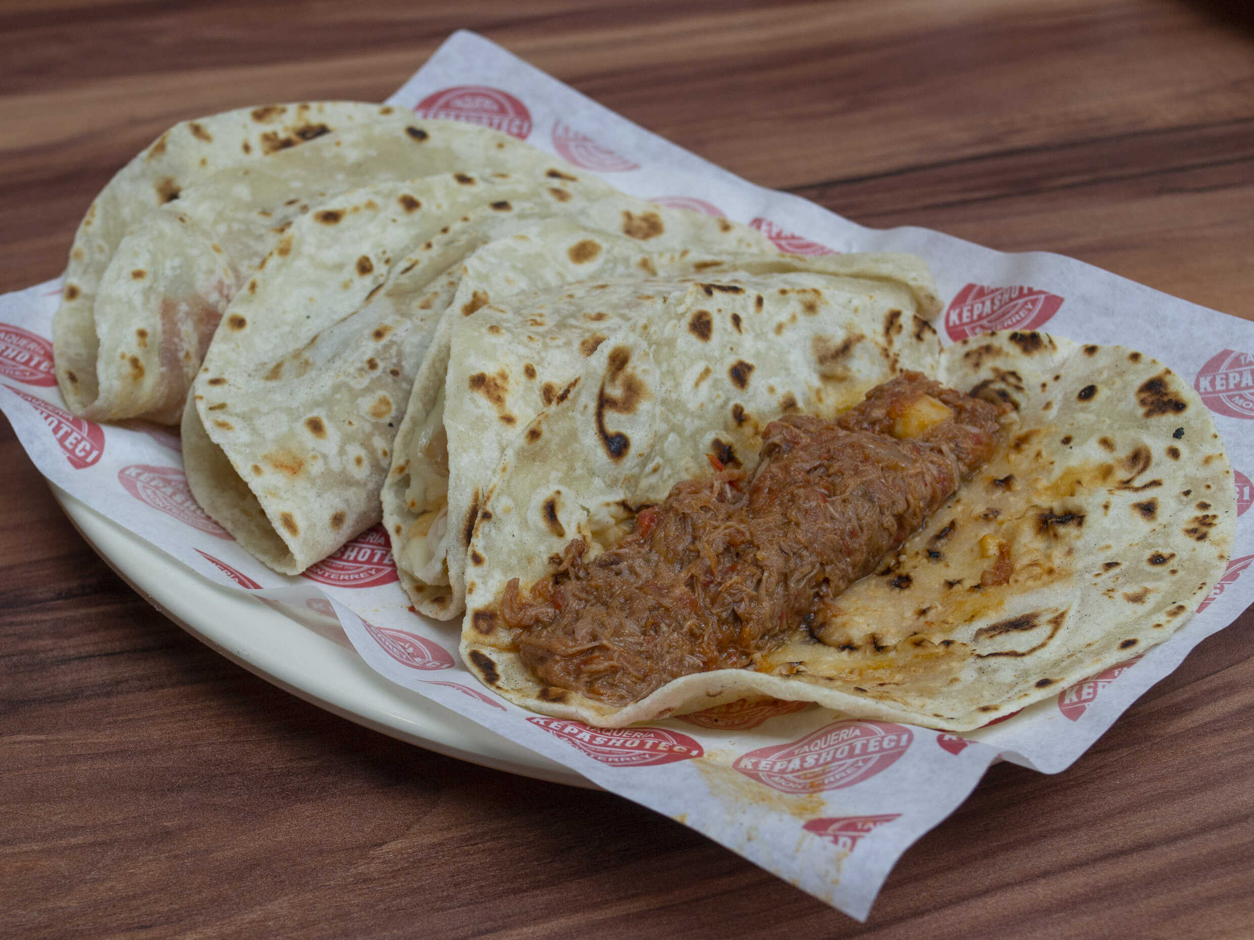 Carne de puerco y res en trozos, con salchicha y tocino, sazonada.