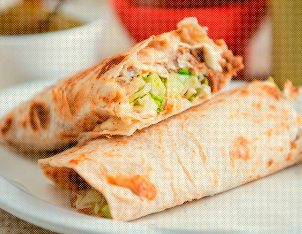 Frijoles, queso, lechuga, tomate y aguacate. Tortilla de harina de 28 centímetros.