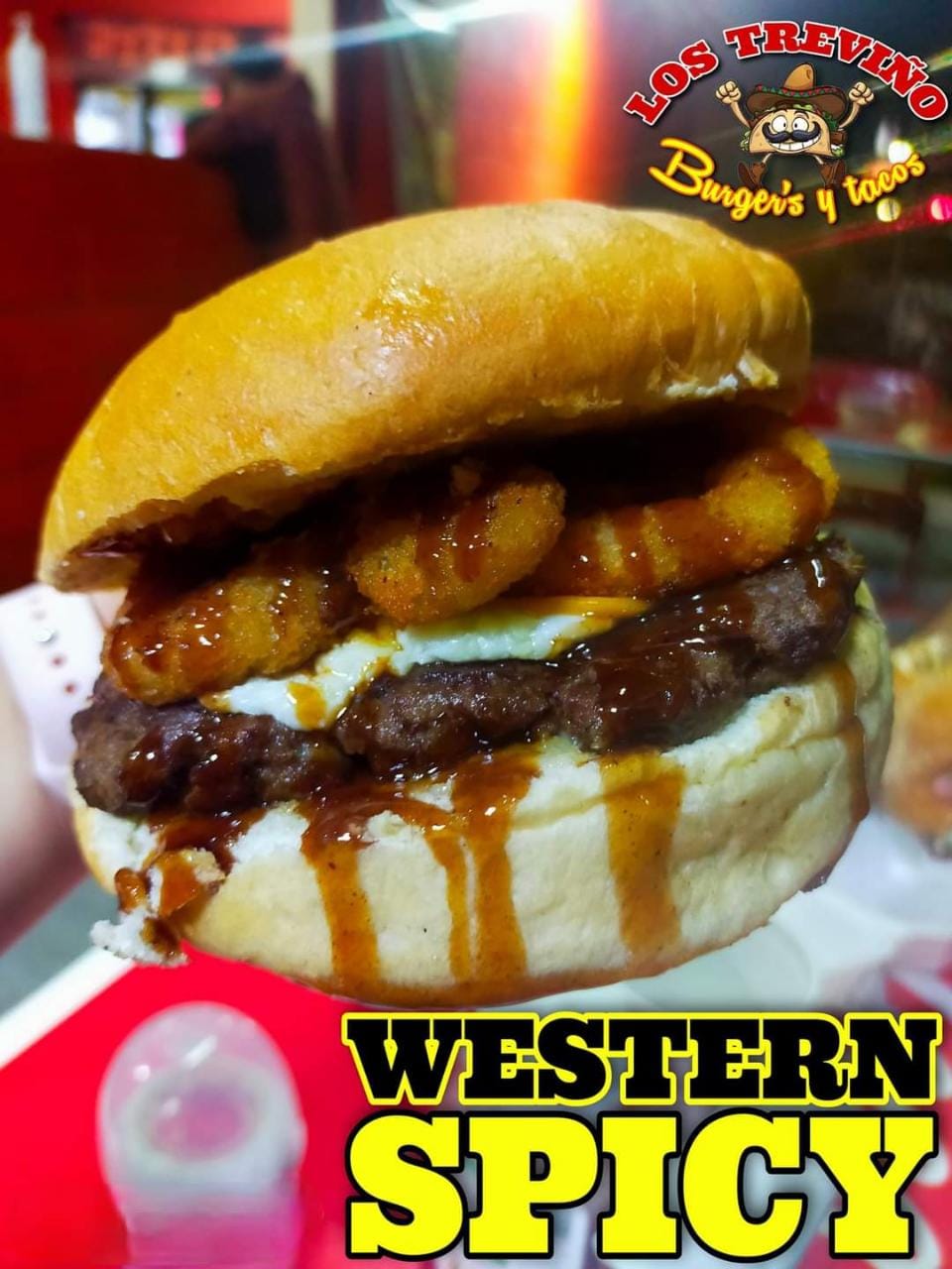 Pan de margarita grande, carne de hamburgesa casera de 130gramos, tiras de tocino, aros de cebolla fritos, mezcla de quesos, queso cheddar, mezcla de aderezos. Al carbón..