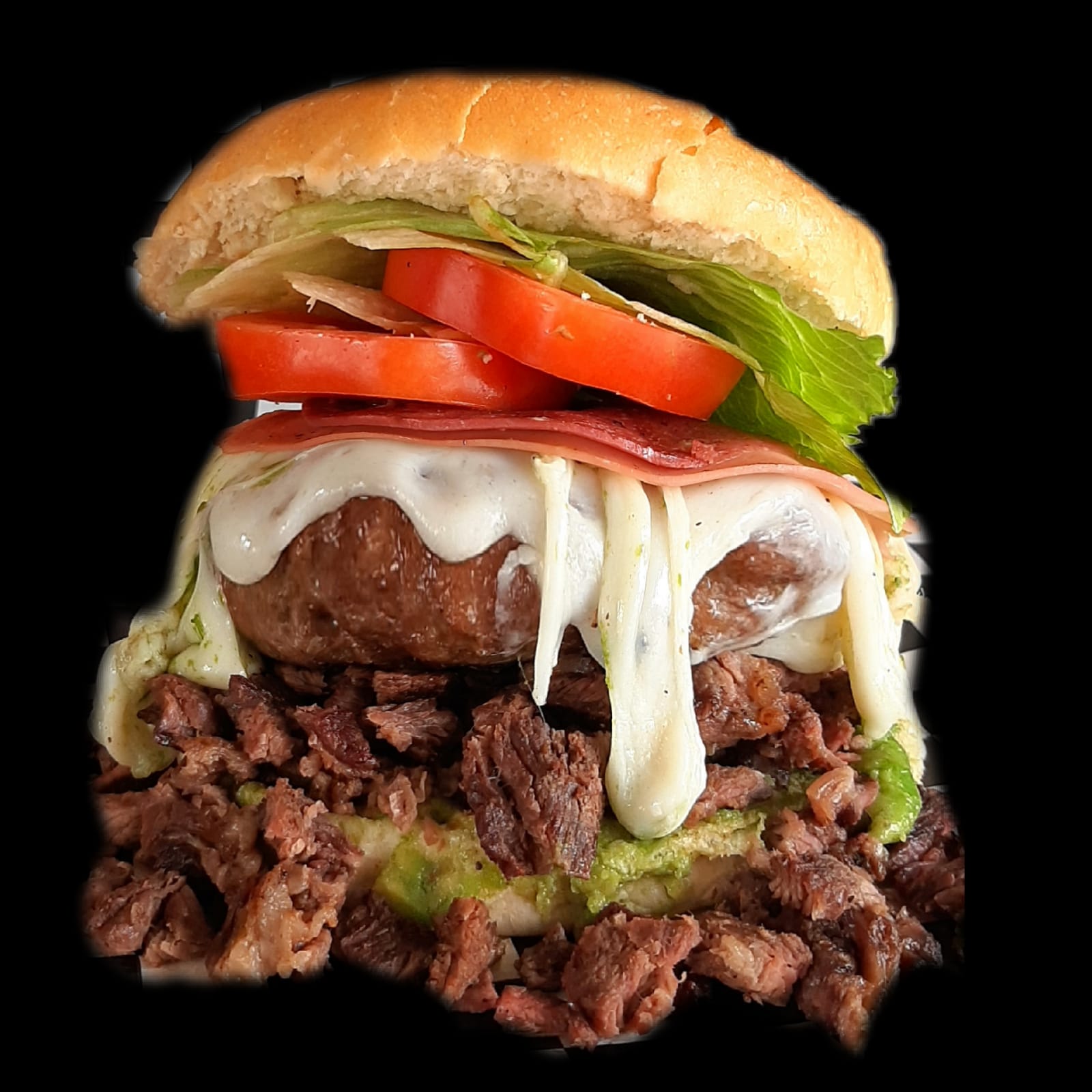 Pan de margarita grande, carne de hamburgesa casera de 130gramos, jamon, salami, mezcla de quesos, carne asada, tomate, lechuga, guacamole, mayonesa, catsup, mostaza. Al carbón..
