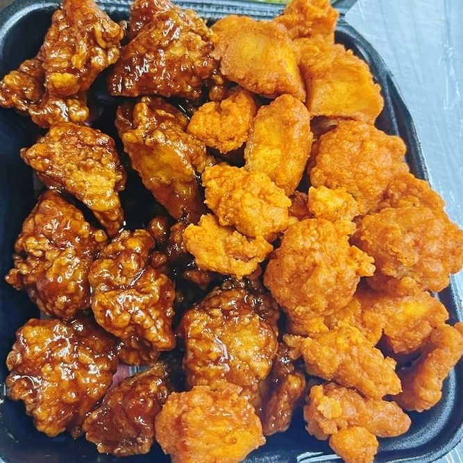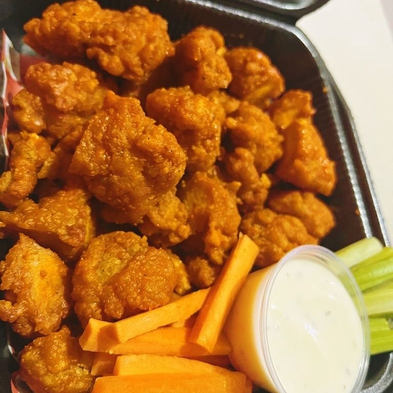 25 trozos de pechuga de pollo bañadas en salsa de su elección acompañadas con 200gr de papa a la francesa, zanahoria, apio y aderezo ranch.