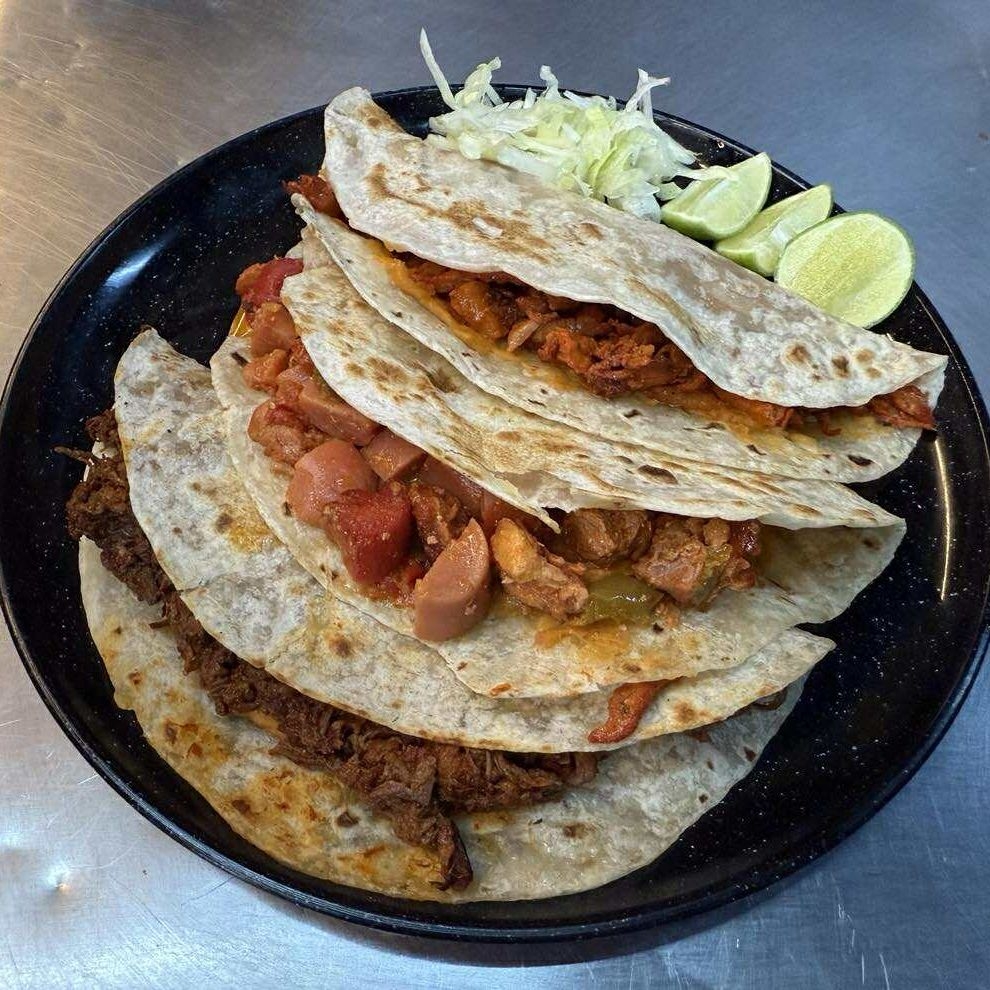 Tortilla de harina de 28cm, barbacoa, aguacate opcional, queso oaxaca opcional. Acompañado aparte cilantro con cebolla, salsa verde y roja y limon.