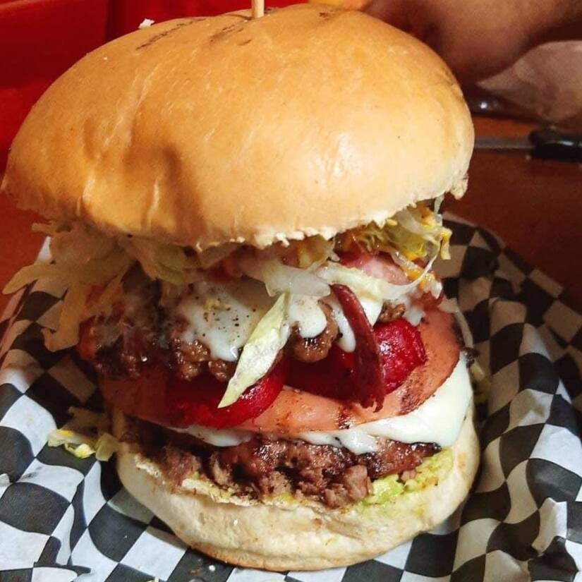 Pan de margarita grande, doble carne de hamburgesa casera de 130gramos, jamon, salami, mezcla de quesos, tomate, lechuga, guacamole, mayonesa, catsup, mostaza. Al carbón..