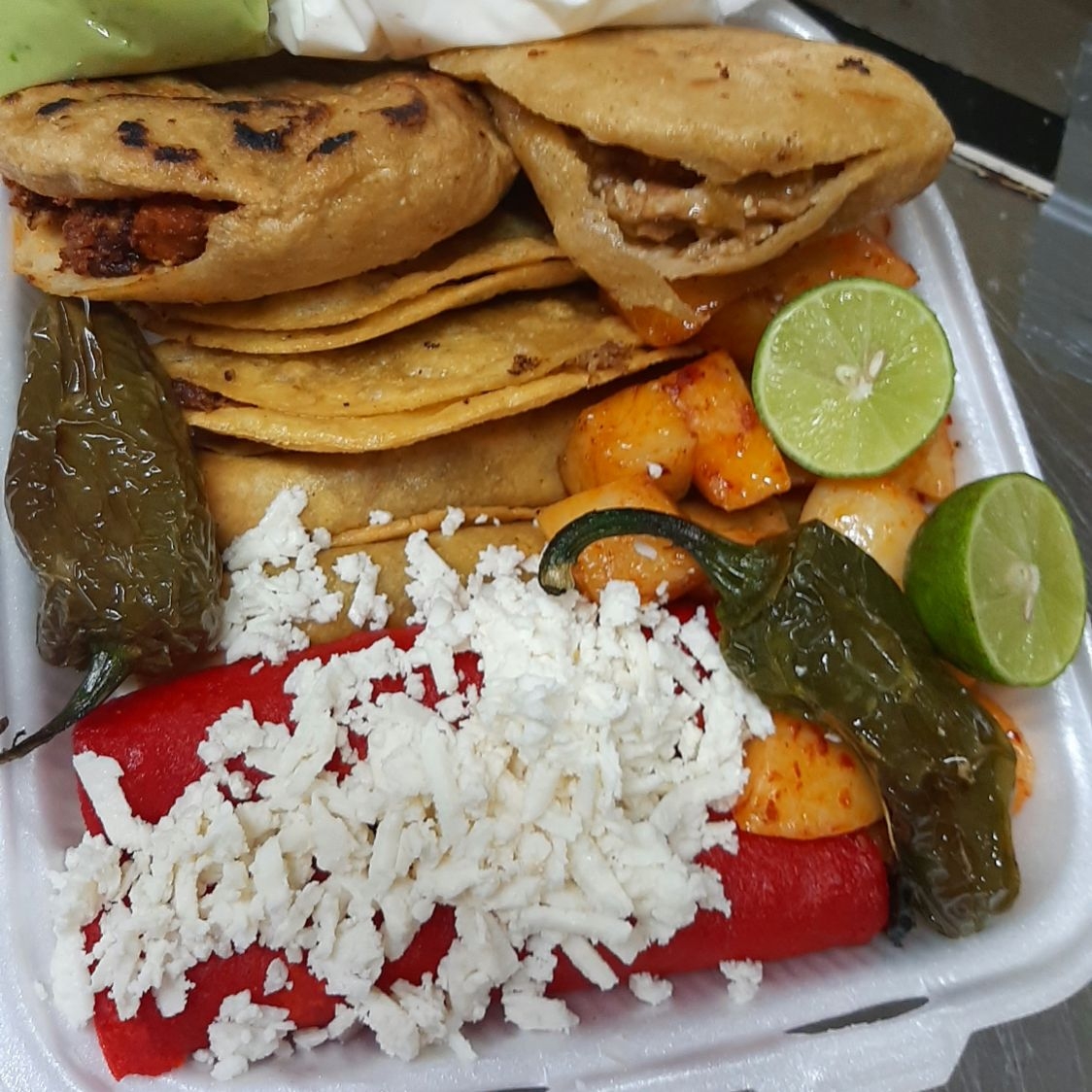 2 Enchiladas, 2 Flauta, 2 Tacos Dorado, 2 Gorditas surtidas, papas rojas, lechuga, guacamole y crema aparte.