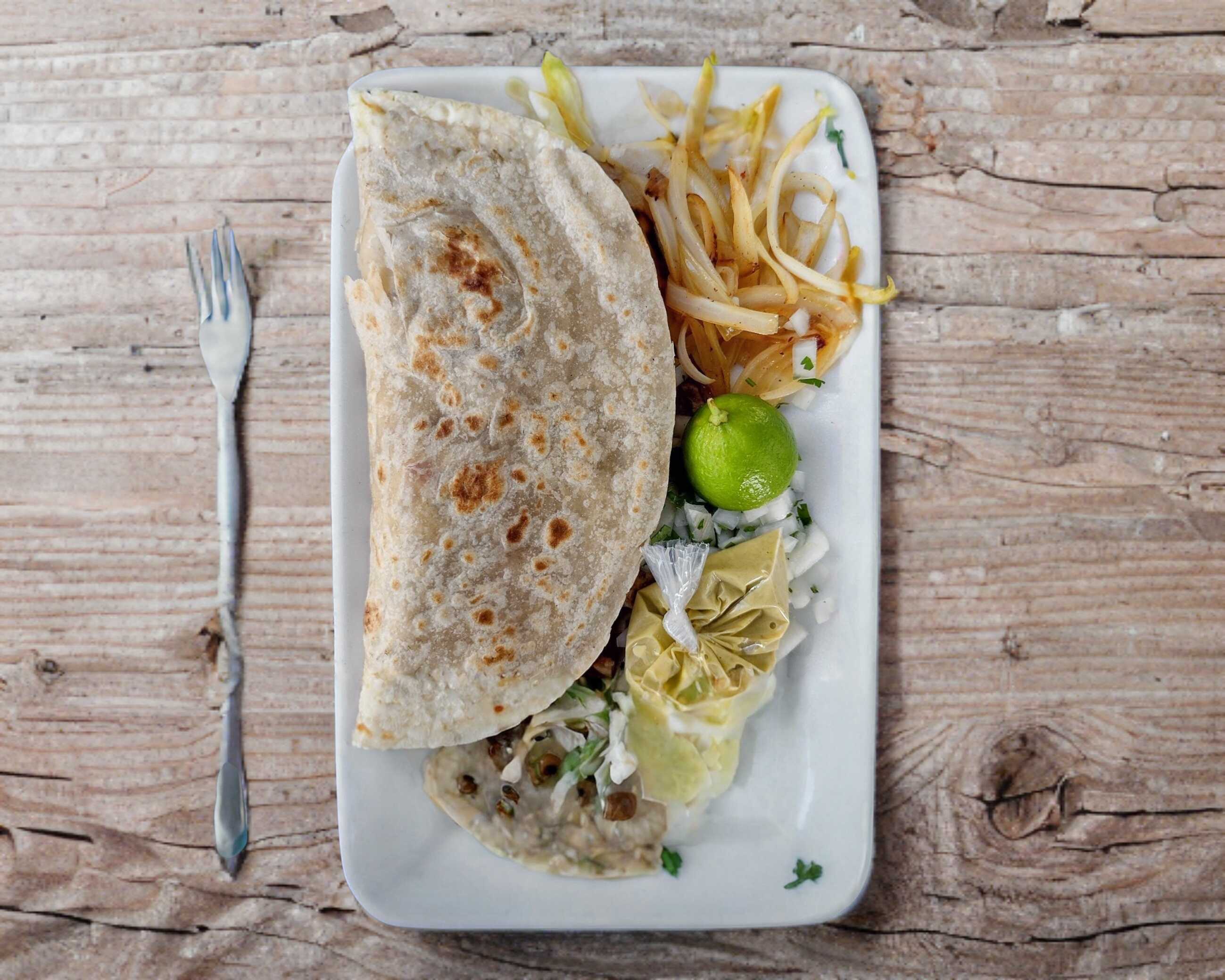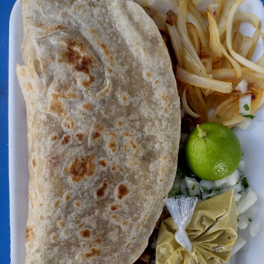 en tortilla de harina, porcion de bistec y trompo, cebolla asada, limon y salsa.