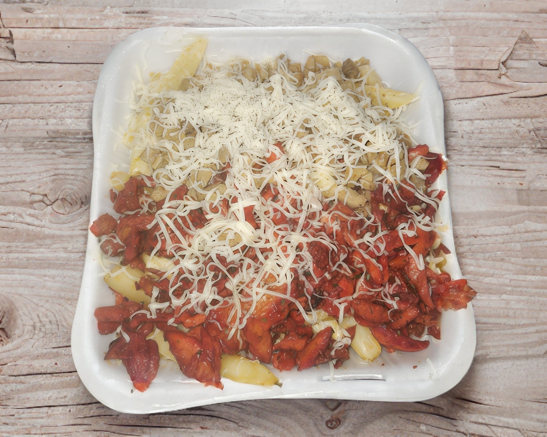 Porcion de papas ala francesa gratinado con queso mescla de bistec y trompo gratinado con queso
