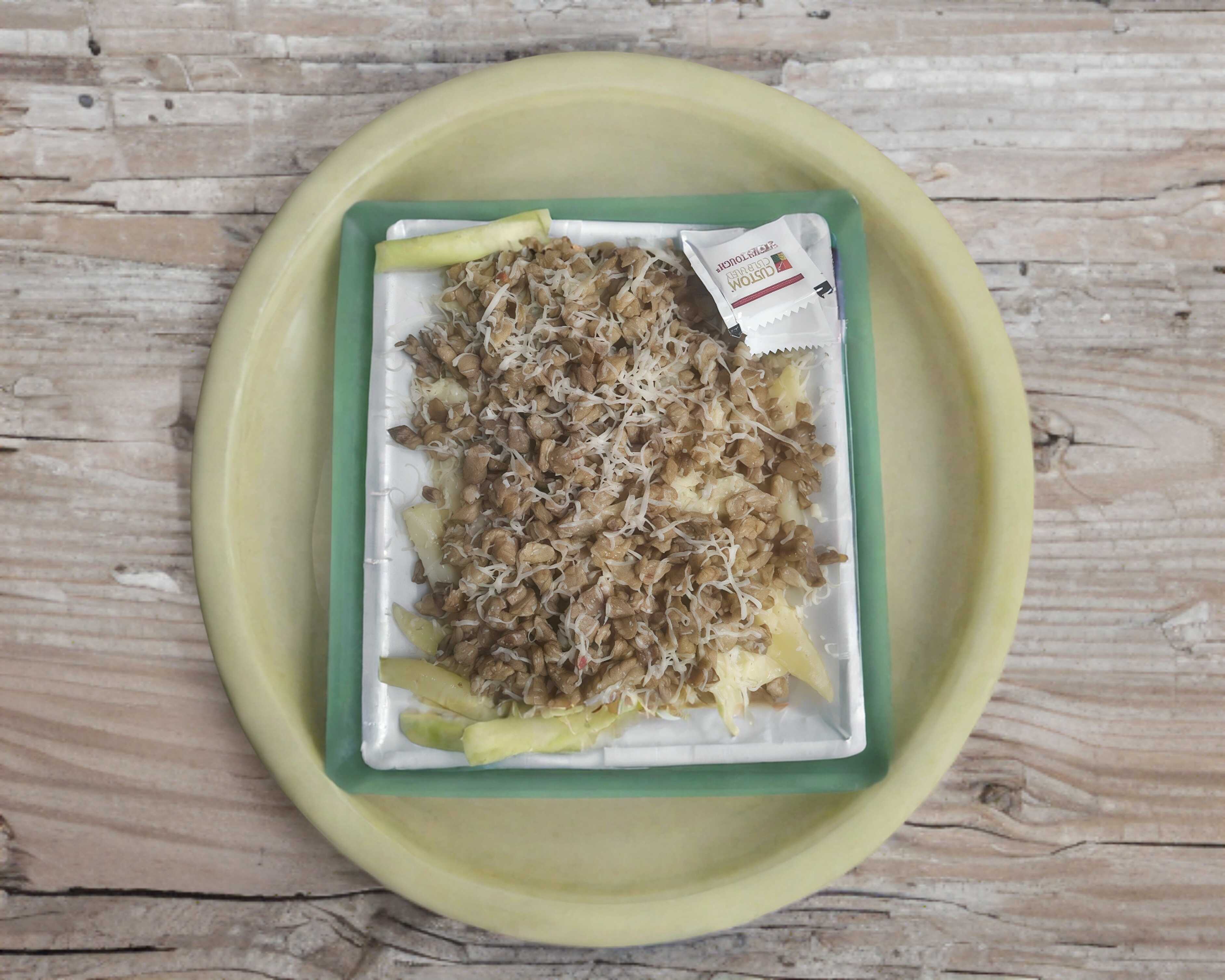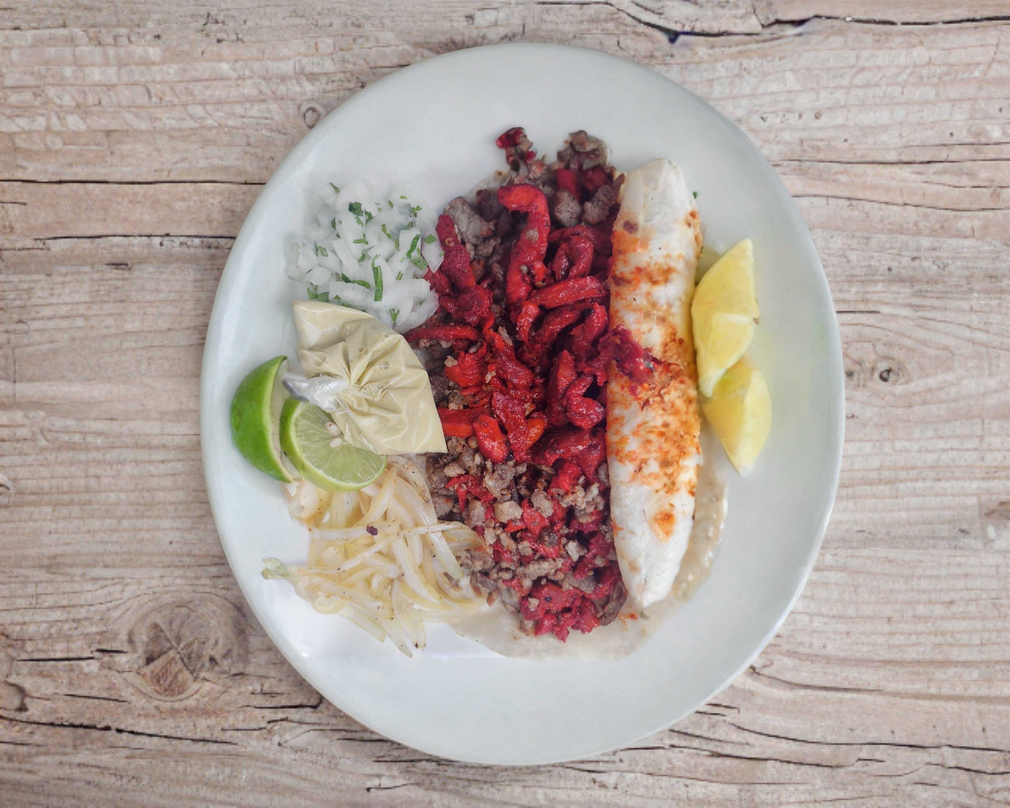 en harina porcion de bistec, salsa, cebolla asada, y limmon