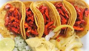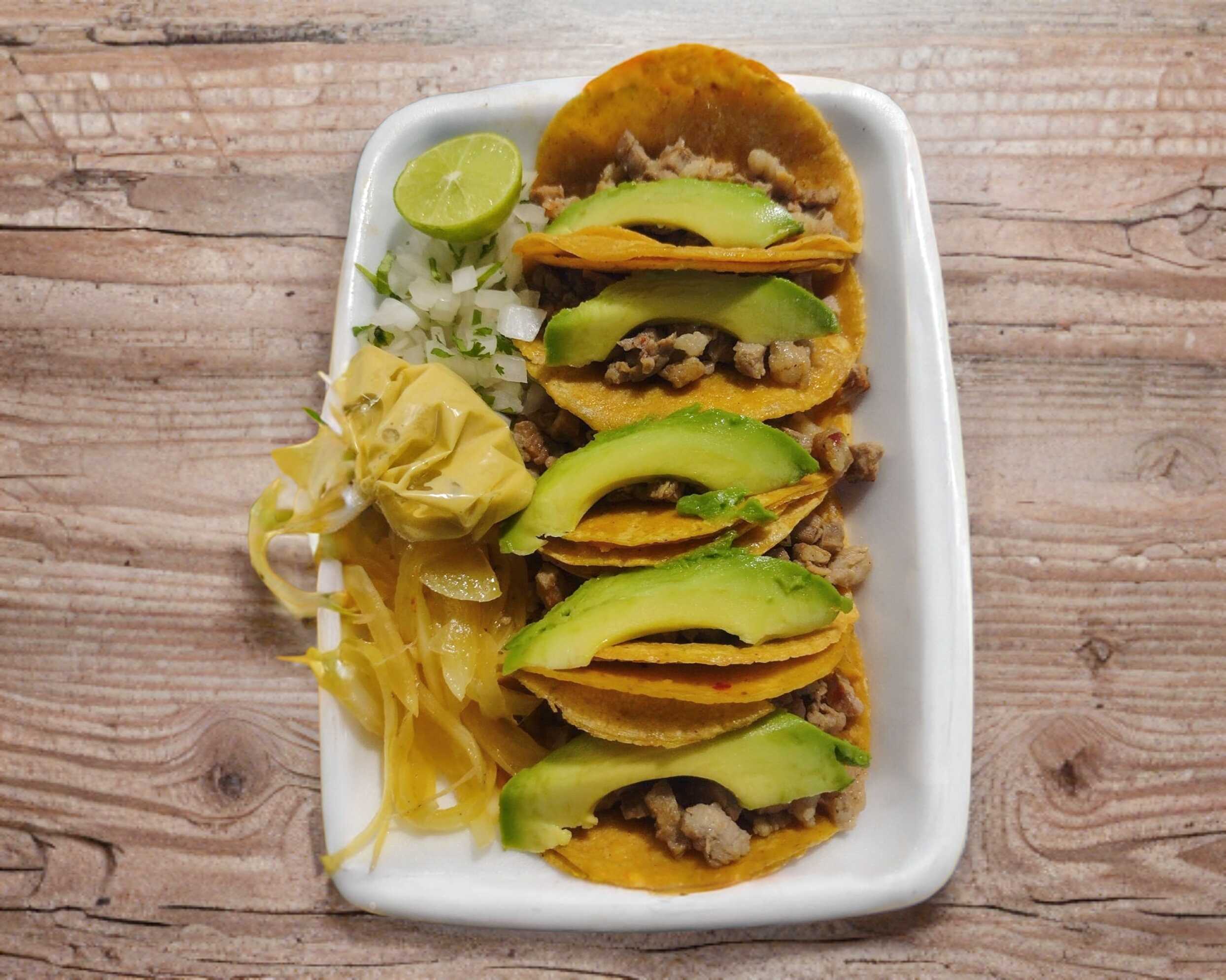 5 tacos de bistec acompañado de aguacate cebolla asada salsa y limones