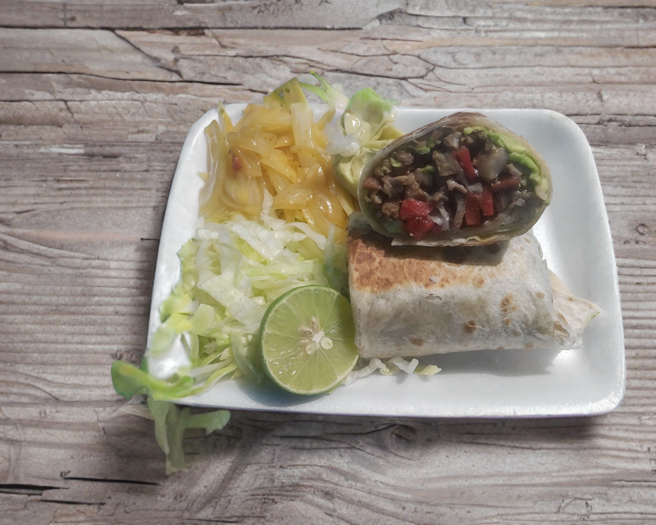 en tortilla de harina, porción de bistec, lechuga, aguacate, cebolla asada, salsa acompañado de papas ala francesa