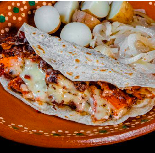 Tortilla en harina con carne de trompo y queso acompañado de cebolla cocida y papa galeana.