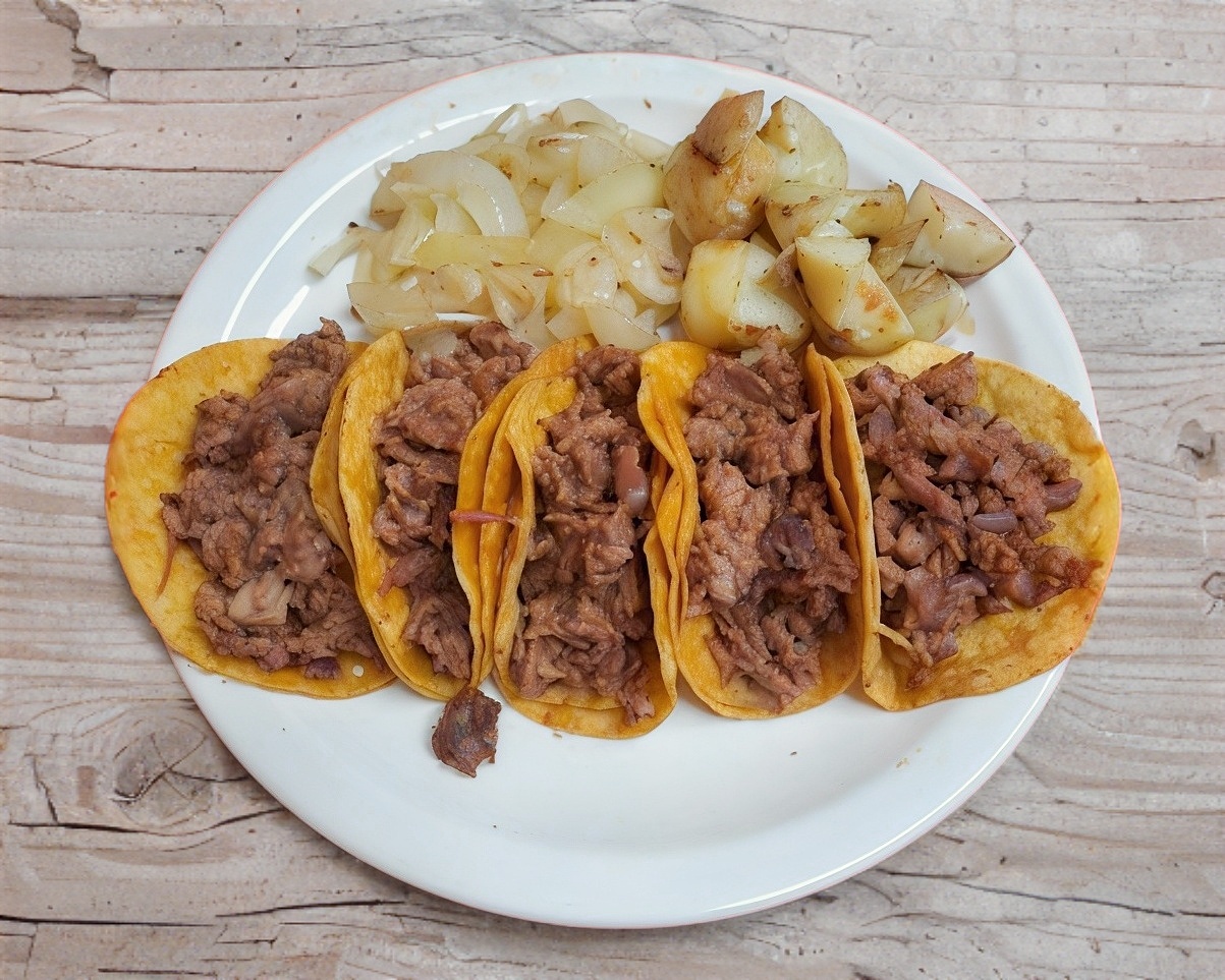 Orden de 5 tacos, carne 100% de res acompañado de cebolla cocida y papa galeana.