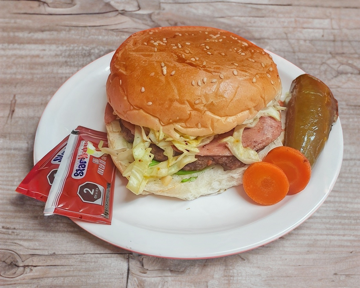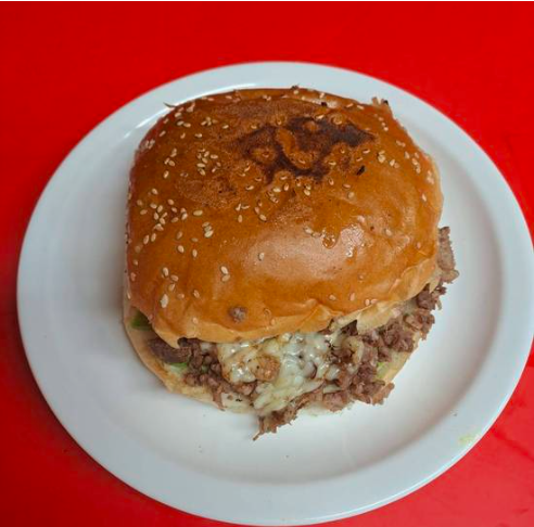 Hamburguesa con carne de res más una porción de carne de trompo, aderezos, jamón, salami, queso, aguacate y lechuga.