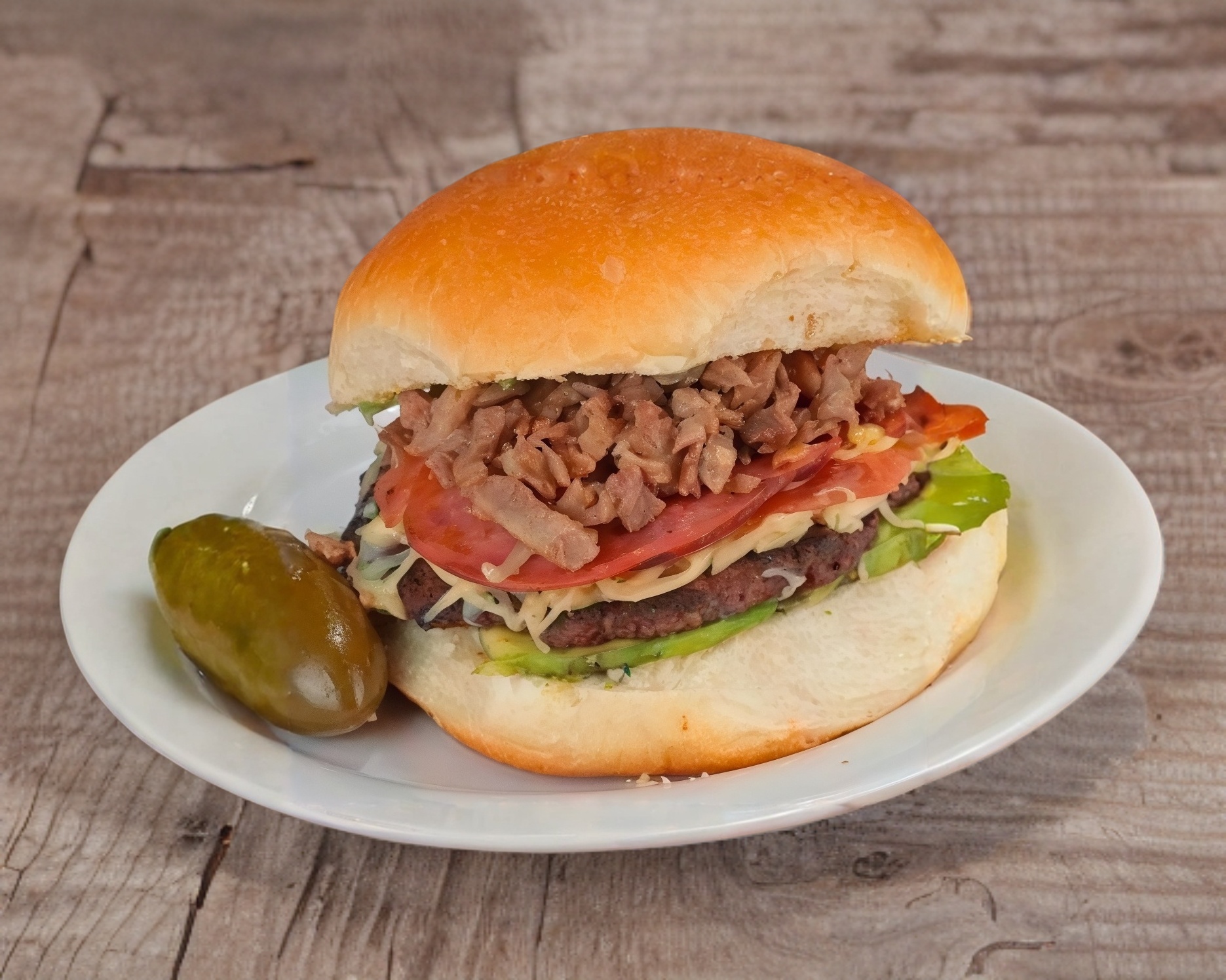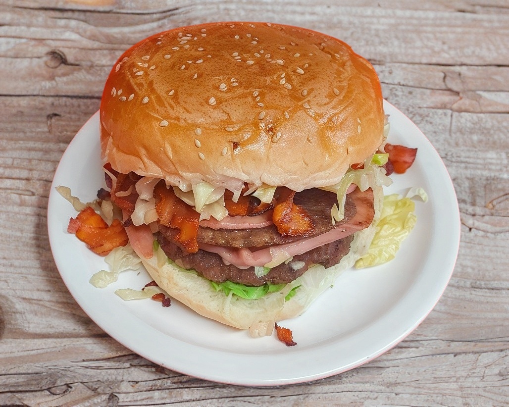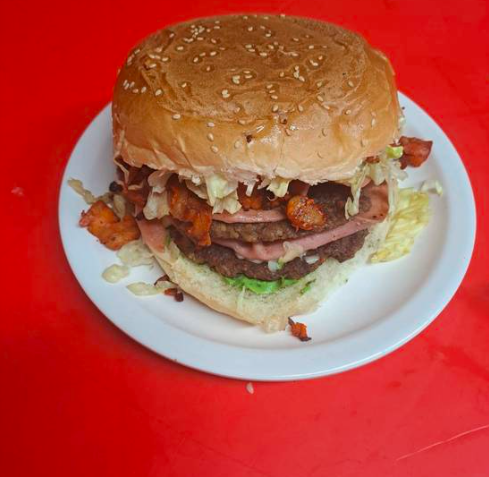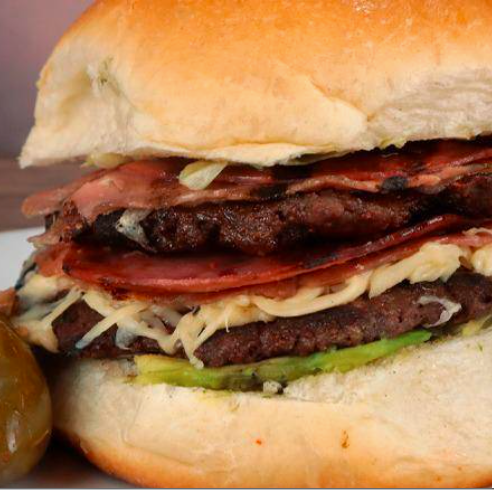 Hamburguesa con doble carne, doble jamón, doble salami, doble queso, aguacate, lechuga y carne de trompo.