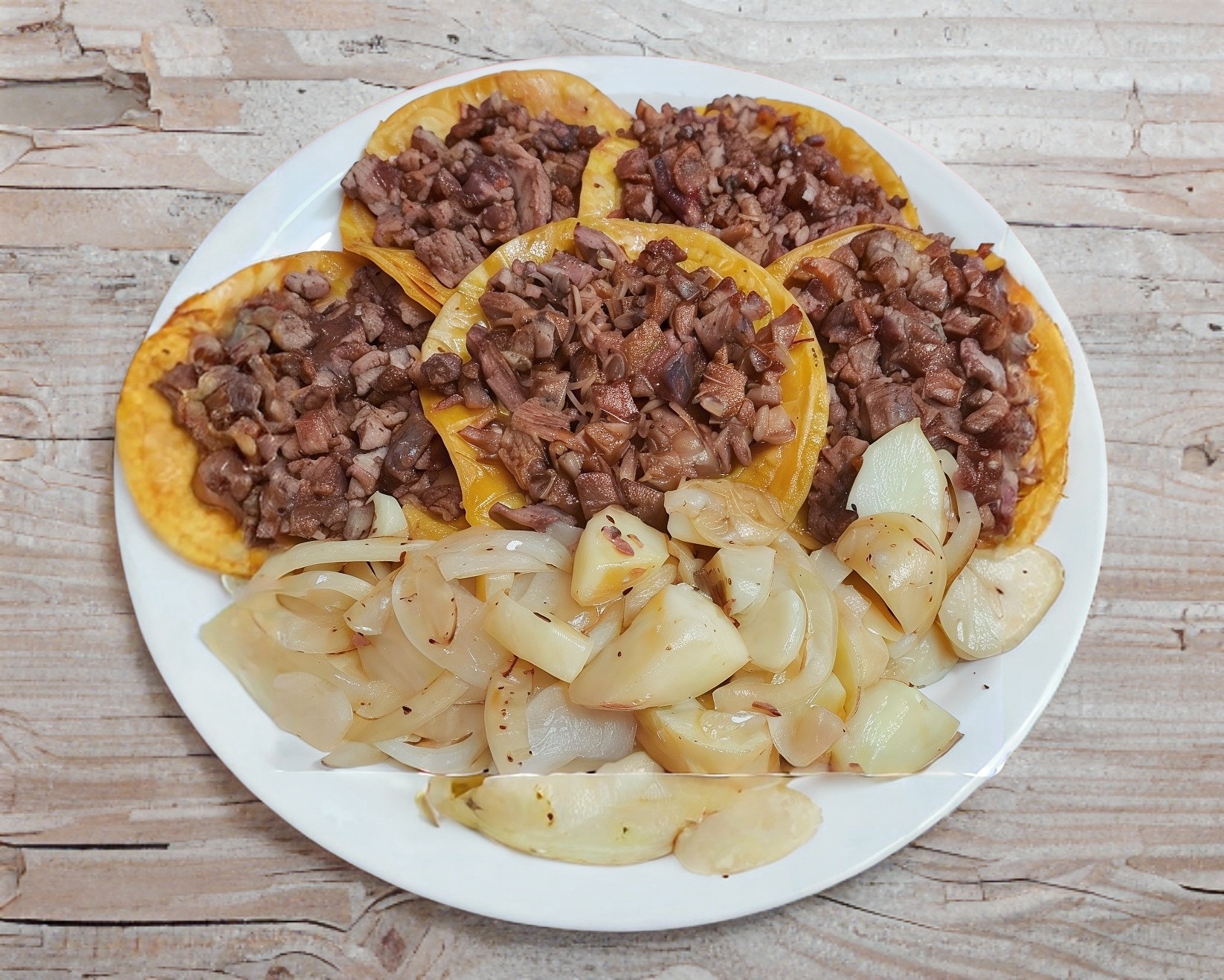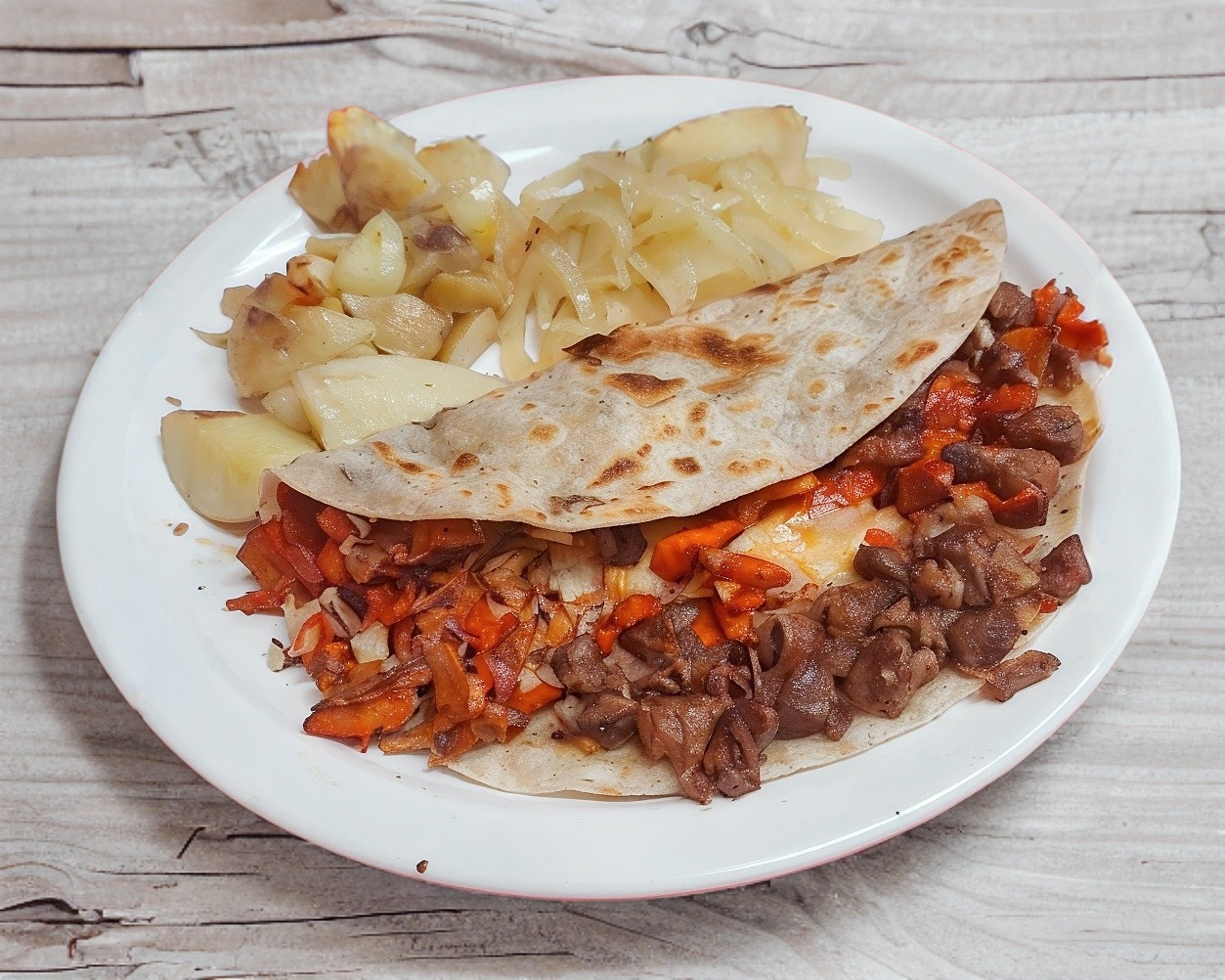 Tortilla en harina con carne de res y queso acompañado de cebolla cocida y papa galeana.