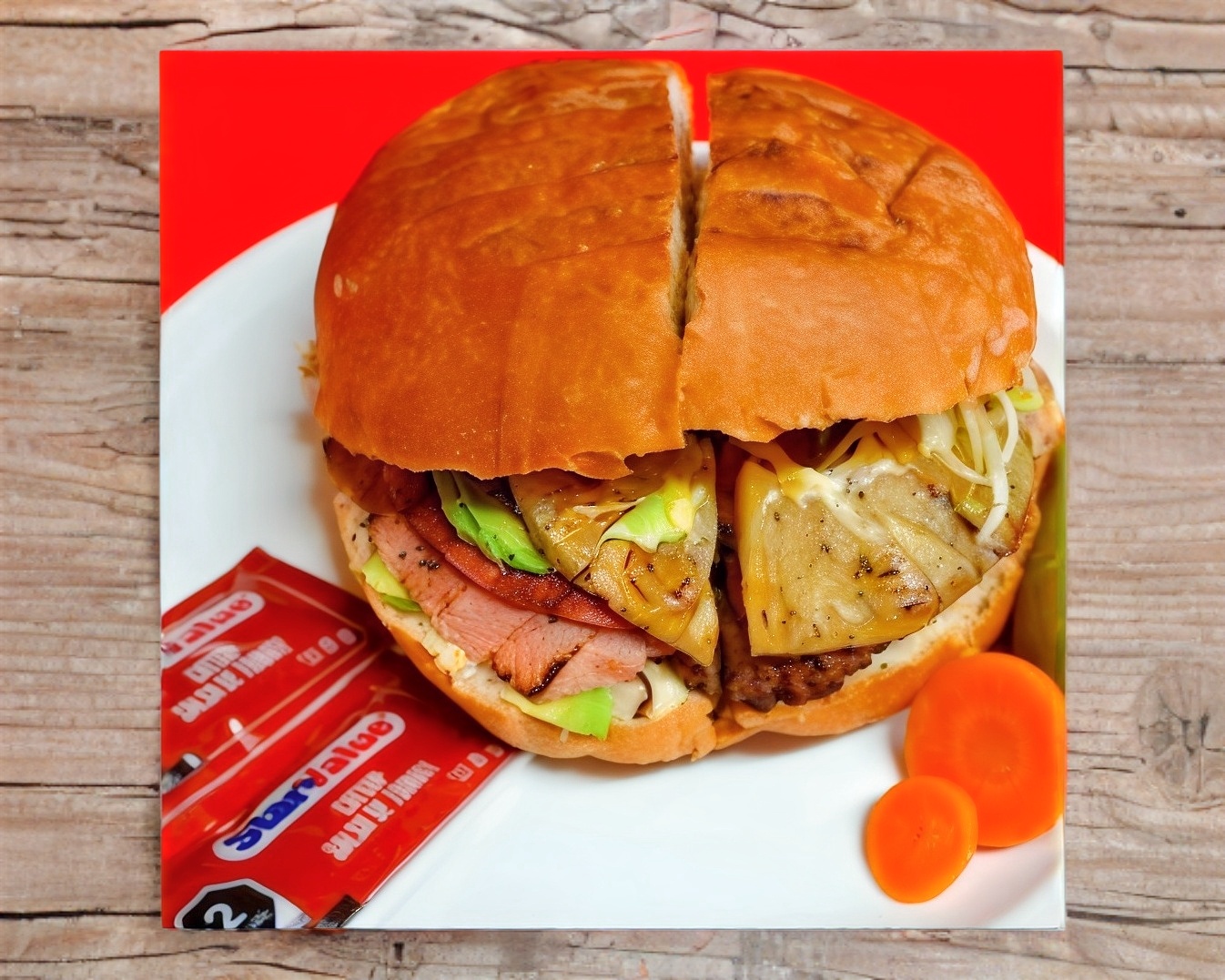 Hamburguesa con carne de res y salchicha roja, aderezos, jamón, salami, queso, aguacate y lechuga.