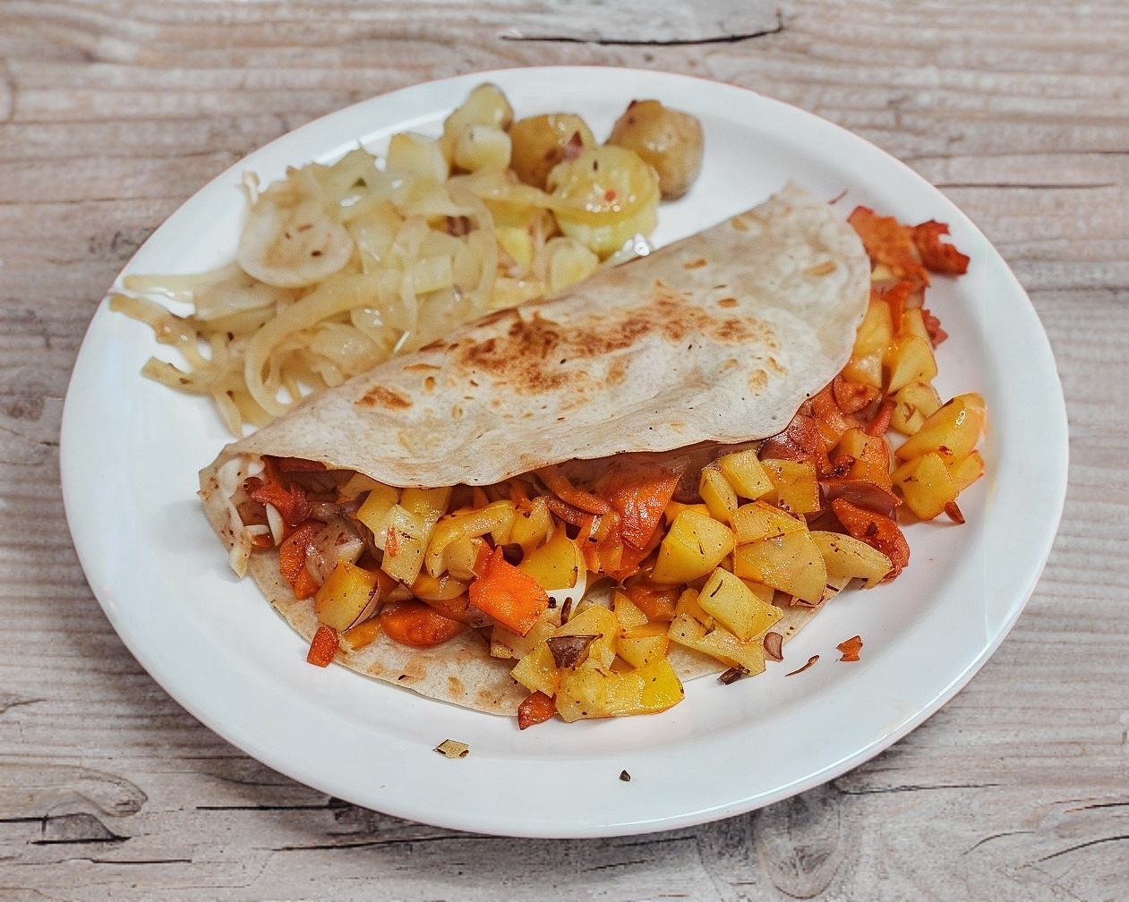 Tortilla en harina con salchicha roja y queso, acompañado de cebolla cocida y papa galeana.