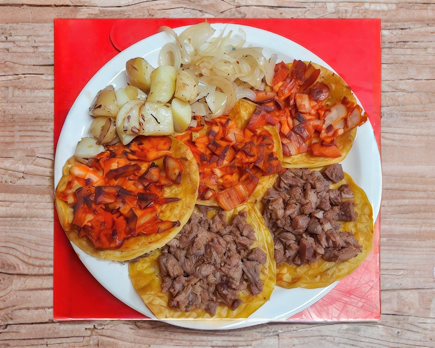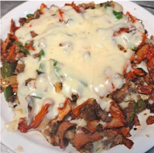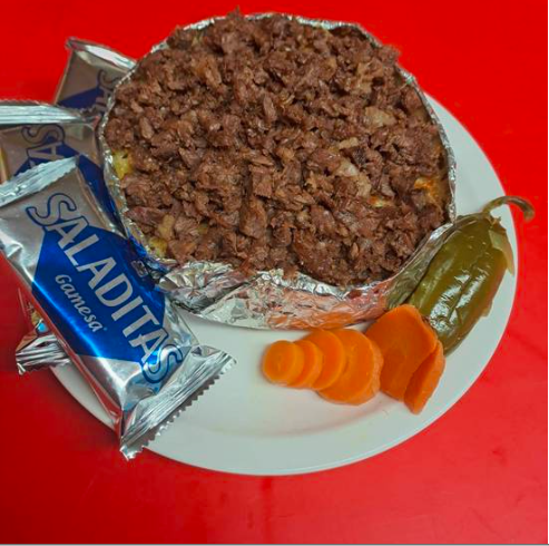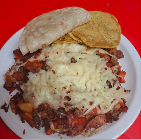 Morrón, cebolla, jamón, tocino, carne de bistec con queso fundido y 10 tortillas de maíz con 3 de harina.