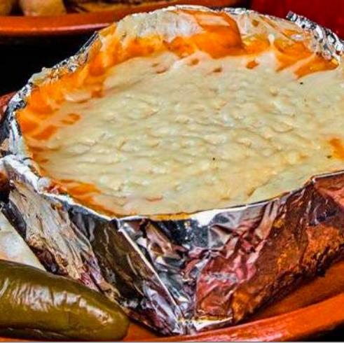 Costra de queso con carne de trompo y bistec, acompañado de cebolla cocida y papa galeana.