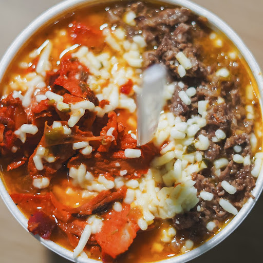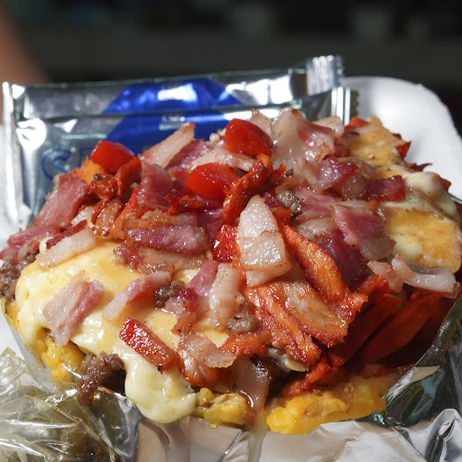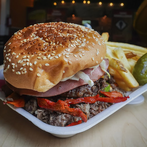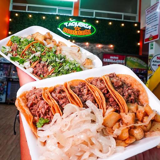 Huevos a elección entre estrellados o revueltos, bañados en nuestra salsa rodriguez, acompañados de carne asada y frijoles refritos.