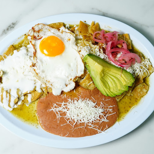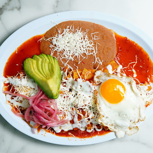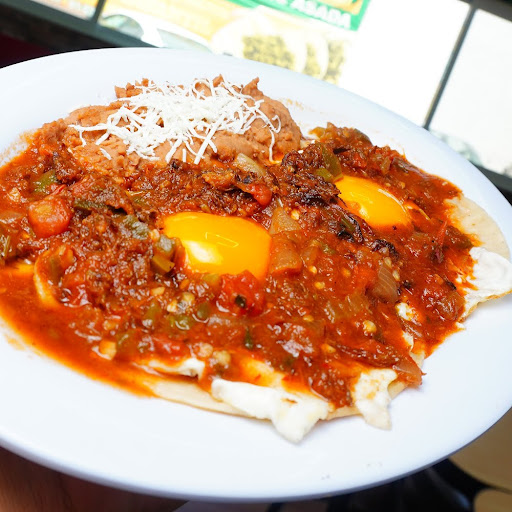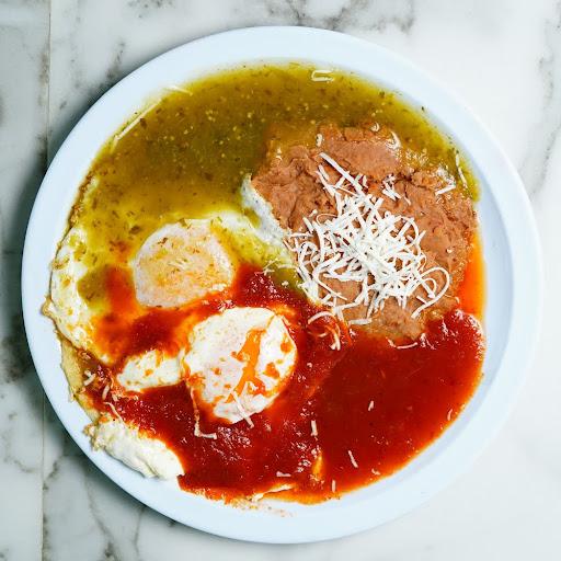 Huevos estrellados sobre tortilla frita, bañados en salsa roja o verde, con frijoles refritos y queso.
