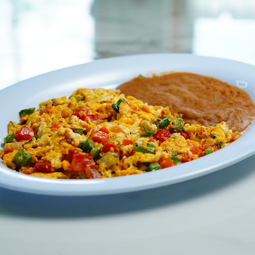 A eleccion estrellados o revueltos con pico de gallo con frijoles refritos y queso.