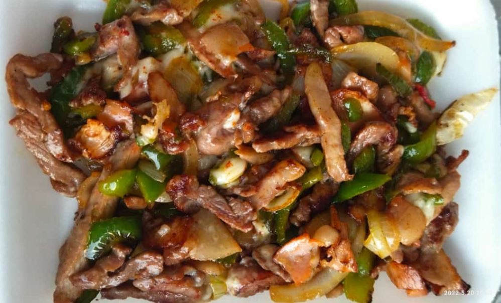 Bistec trompo morrón cebolla tocino queso asadero gratinado