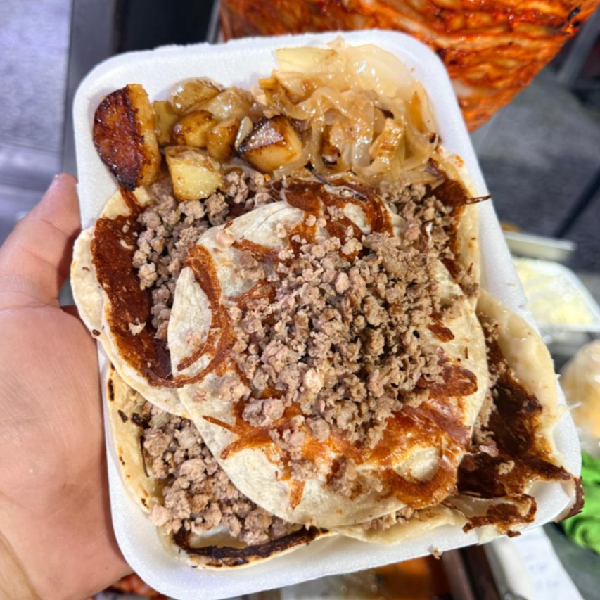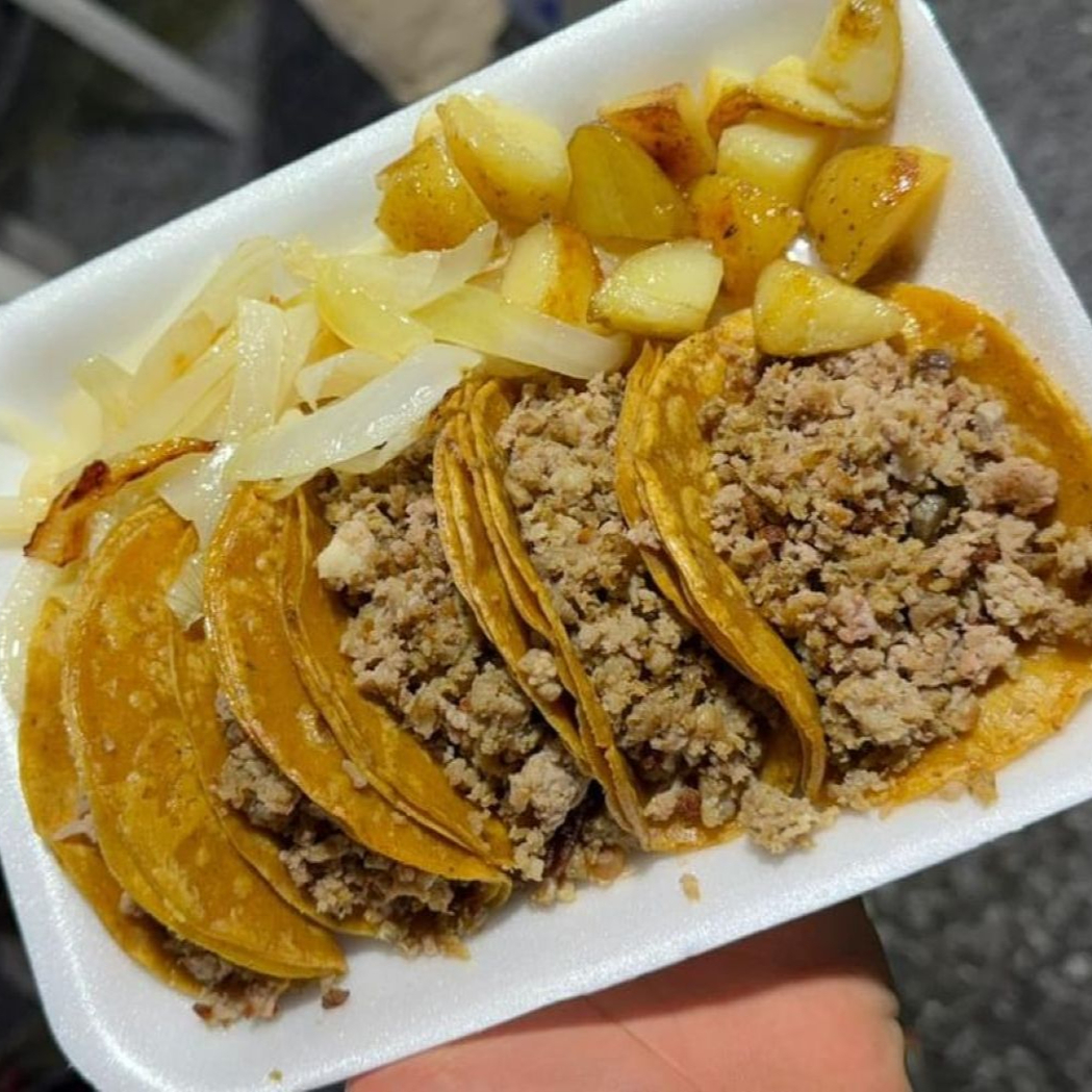 5 tacos de bistec con tortilla de maíz o harina, acompañada de cebolla dorada con papa galeana, cebolla fresca cilantro limón y salsa (verde, roja).
