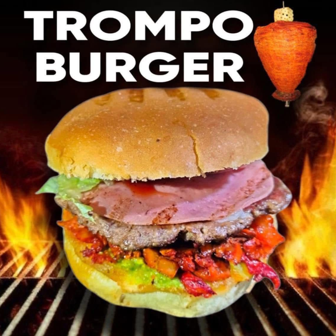 Hamburguesa con carne de trompo carne de pastor acompaña con hojas de lechuga crujiente, rodajas de jitomate jugoso, cebolla fresca.