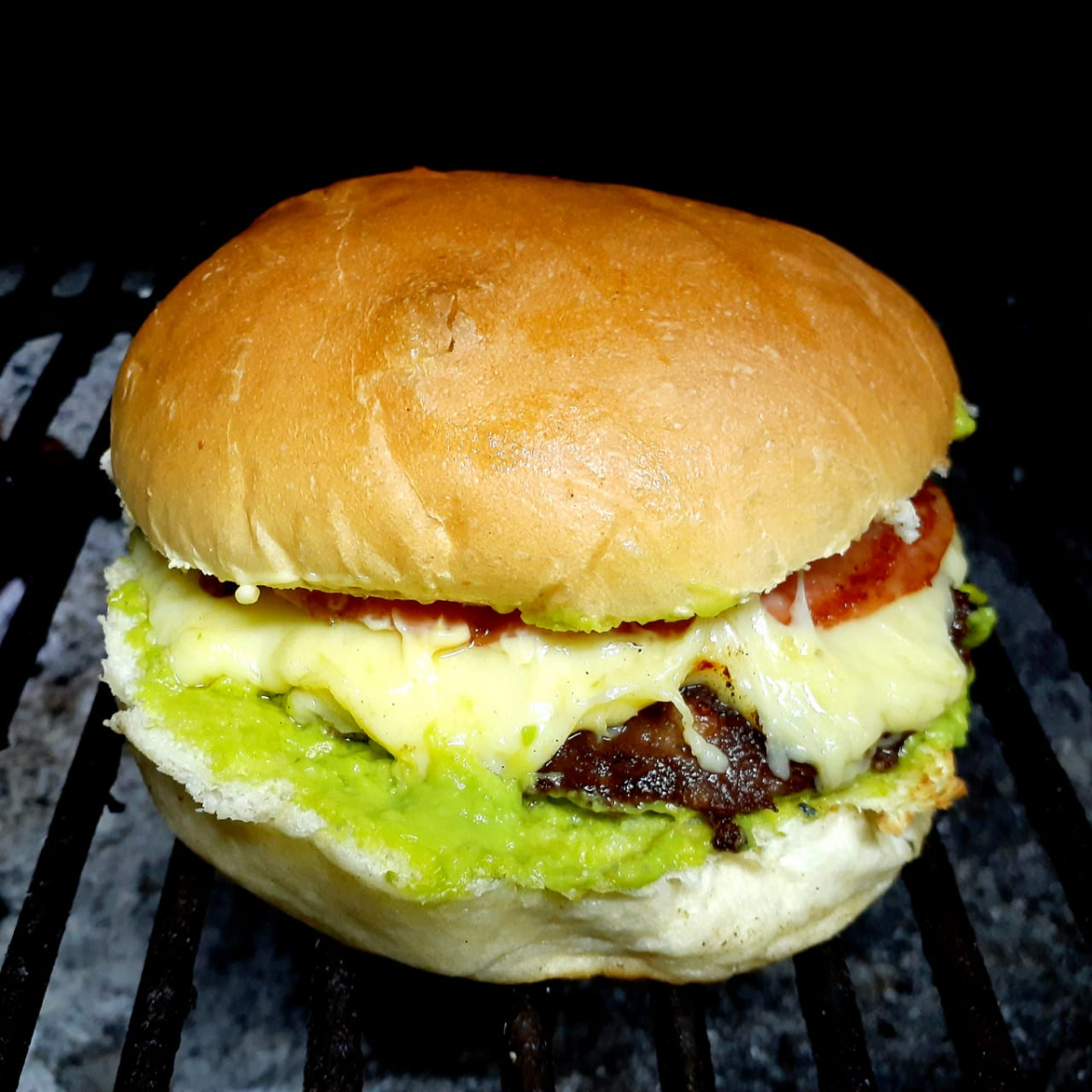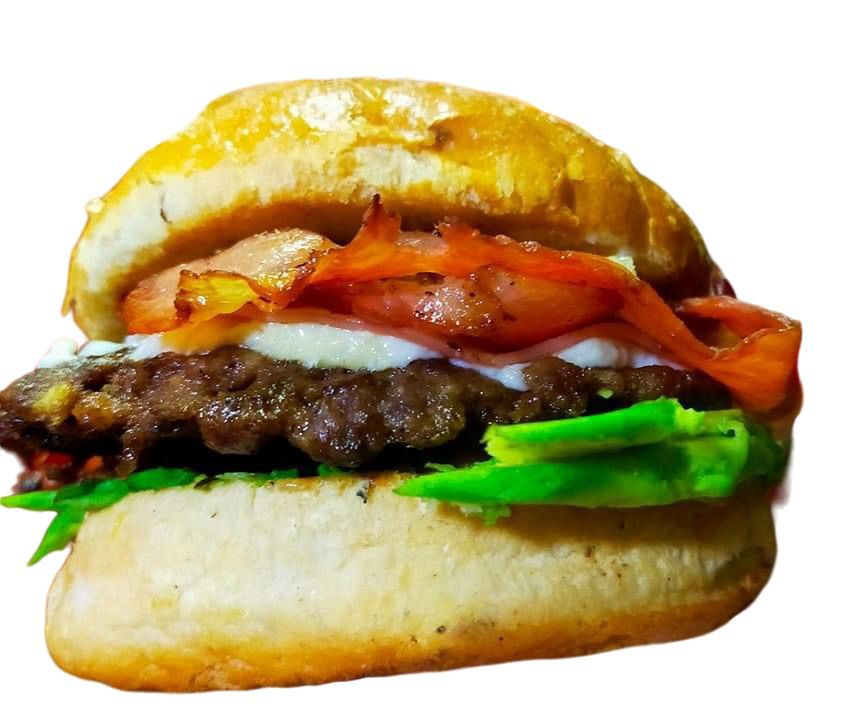 Hamburguesa que incluye guacamole acompañada con hojas de lechuga crujiente, rodajas de jitomate jugoso, cebolla fresca, pepinillos en rodajas.