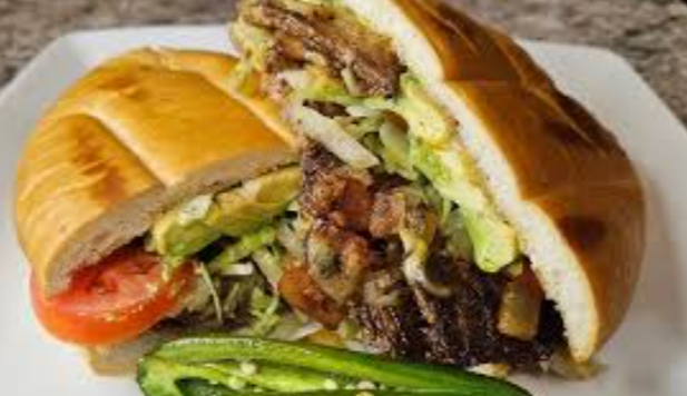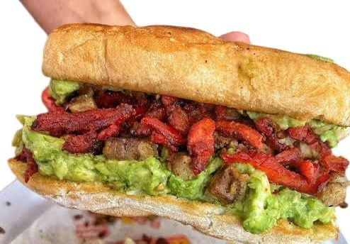 Pan recien horneado, aguacate, carne asada y trompo(carne al pastor), queso manchego y mayonesa.