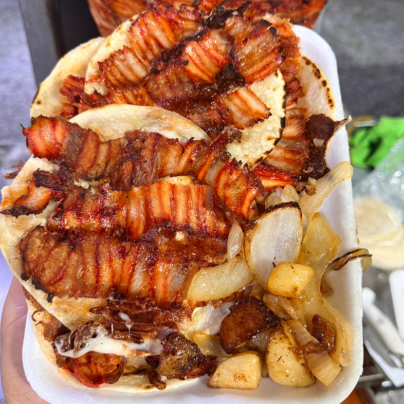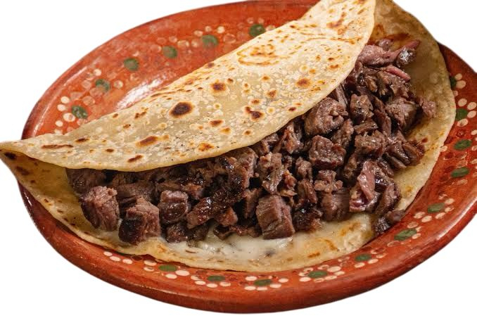 5 tacos de bistec con tortilla de maíz o harina con queso, acompañada de cebolla dorada con papa galeana, cebolla fresca cilantro limón y salsa (verde, roja).