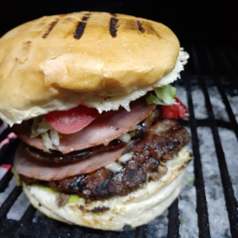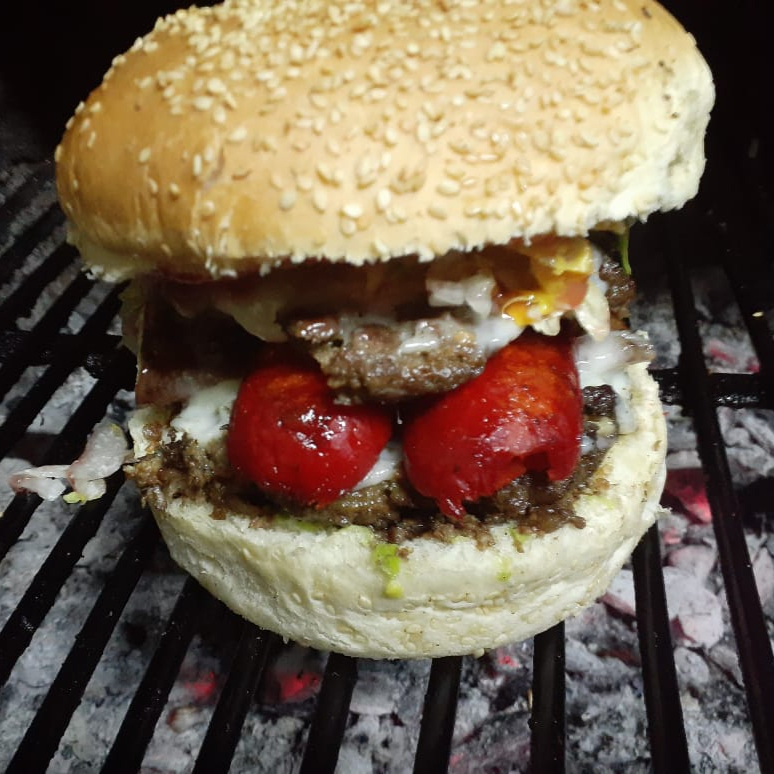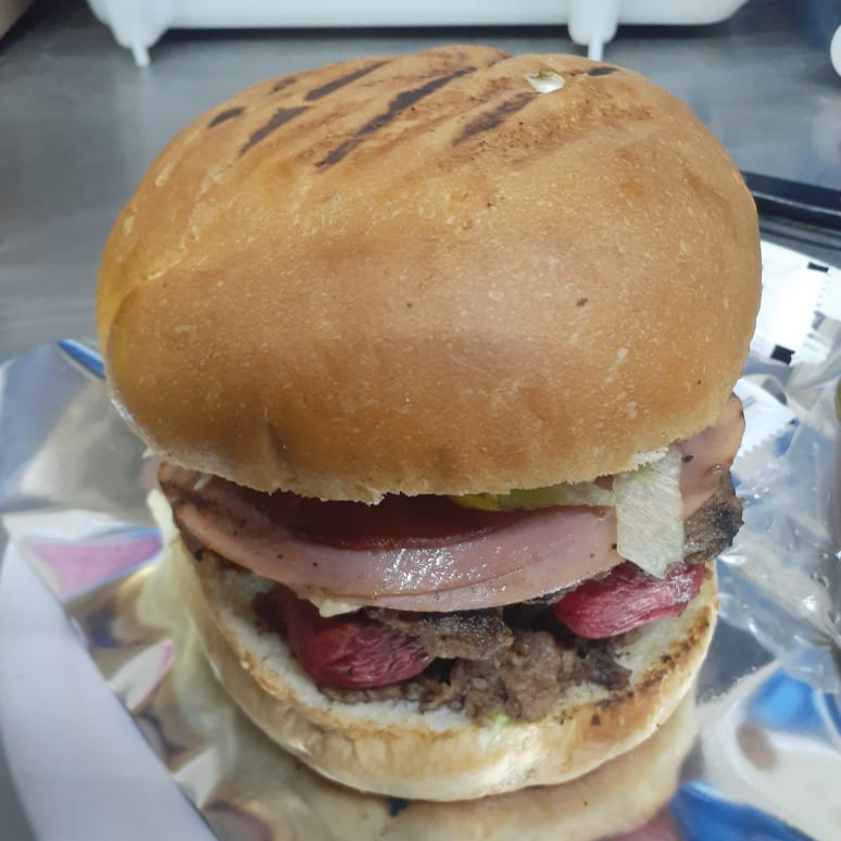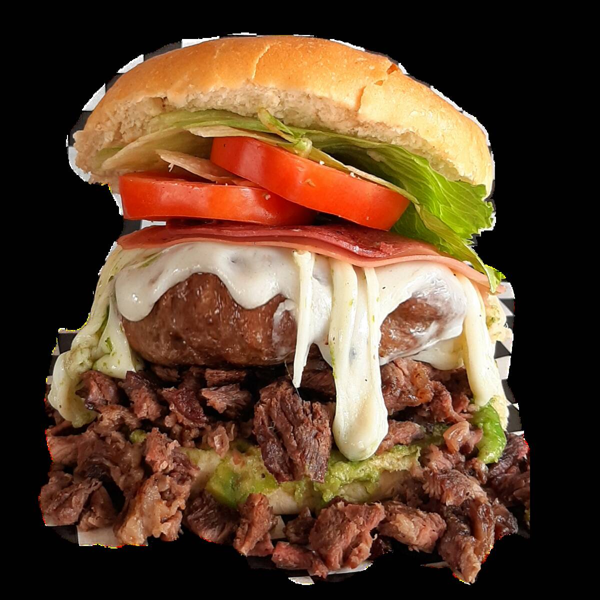 Hamburguesa con una mezcla de carnes de res y carne de pastor, acompaña con hojas de lechuga crujiente, rodajas de jitomate jugoso, cebolla fresca, pepinillos en rodajas.