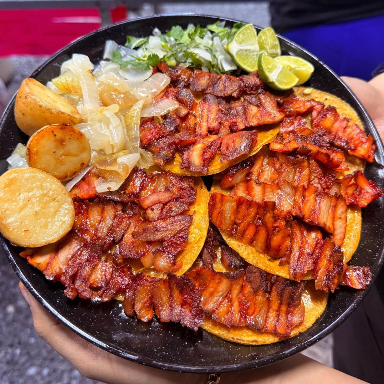 5 tacos de pastor con tortilla de maíz o harina, acompañada de cebolla dorada con papa galeana, cebolla fresca cilantro limón y salsa (verde, roja).