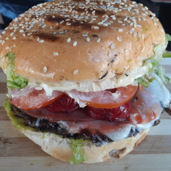 Hamburguesa con doble porción de carne acompaña con hojas de lechuga crujiente, rodajas de jitomate jugoso, cebolla fresca.