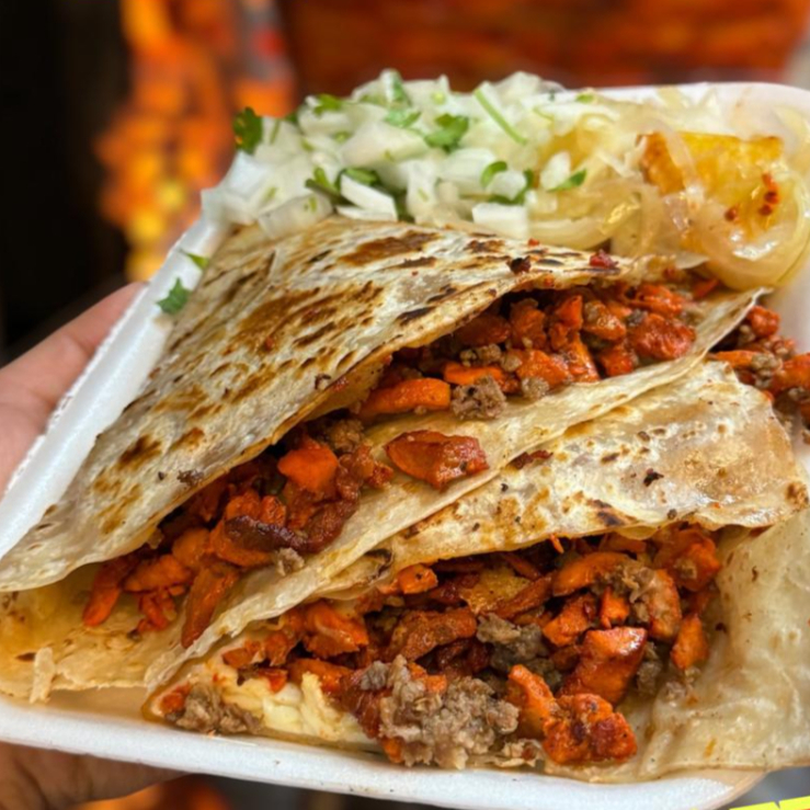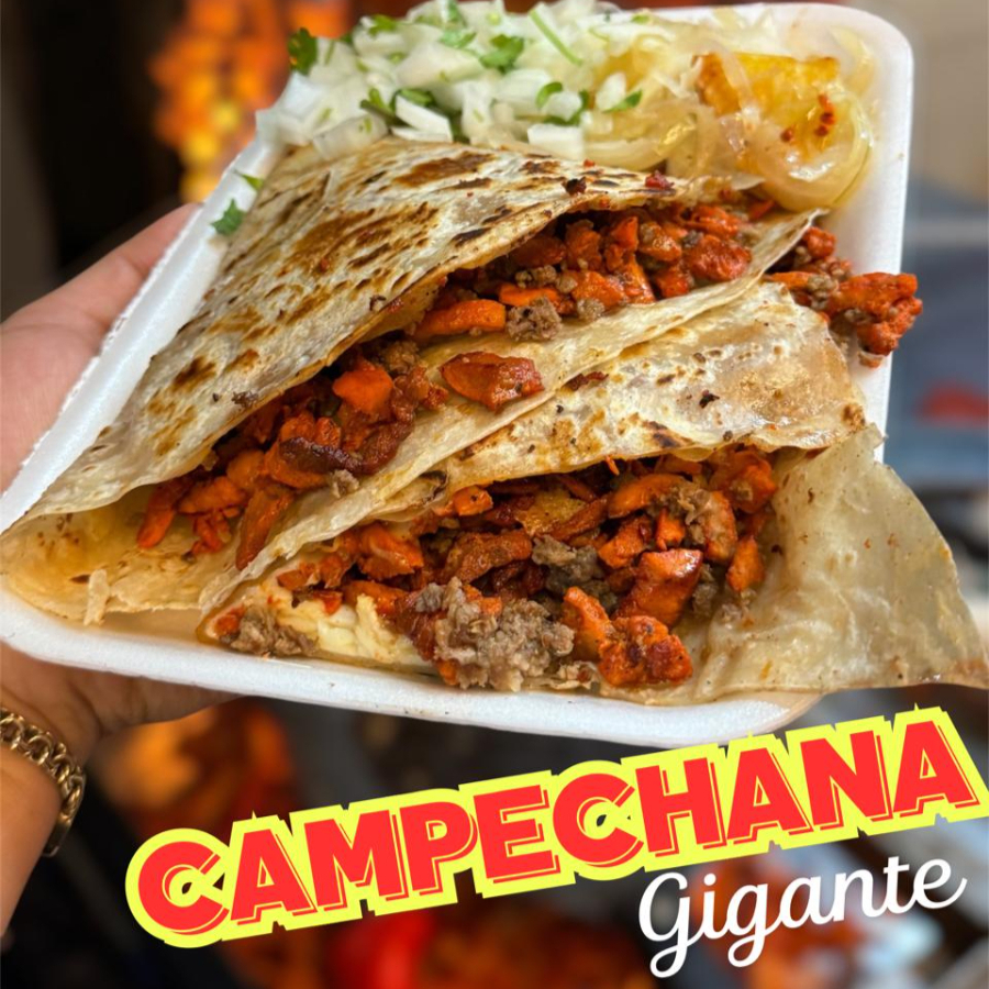 Gringa de tamaño gigante (tortilla de harina con queso y carne al pastor).