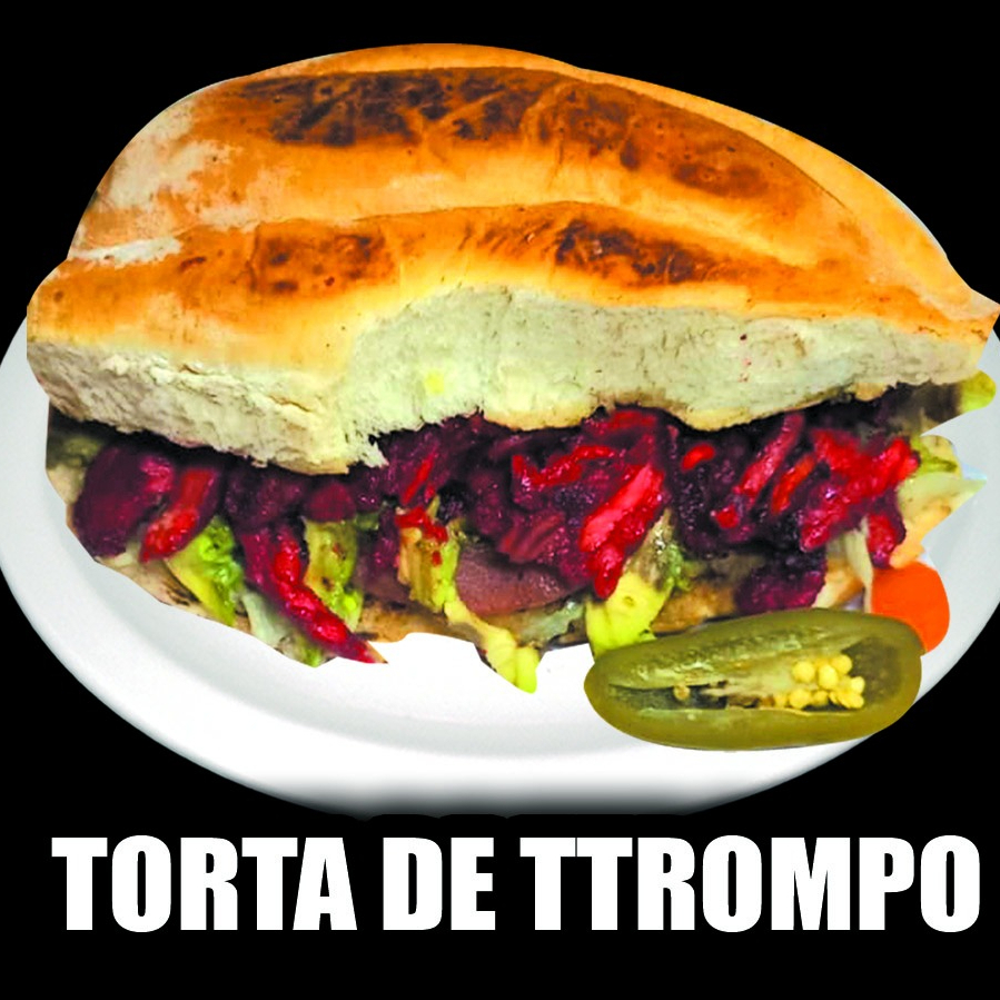 Telera calentada en el comal, mayonesa, aguacate, lechuga, jamon y queso fundido, carne de trompo y chiles vinagres