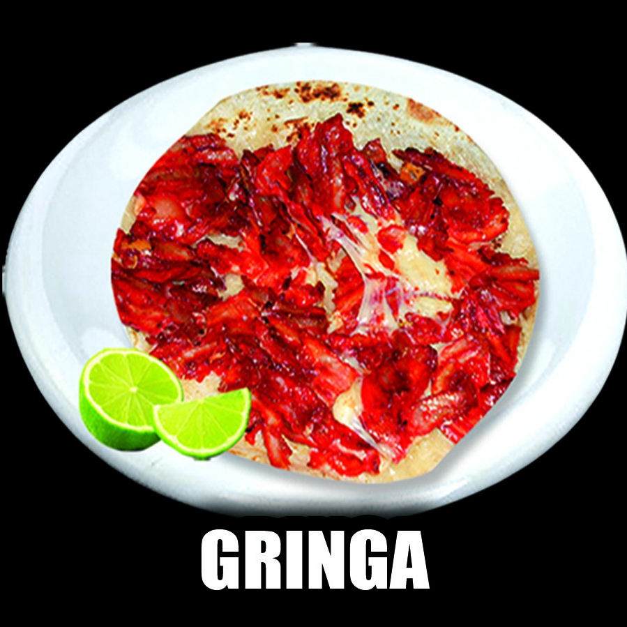 tortilla de harina, acompañado de carne de trompo, queso fundido, cebolla guisada, cebolla y cilantro, salsa verde, salsa roja y limones