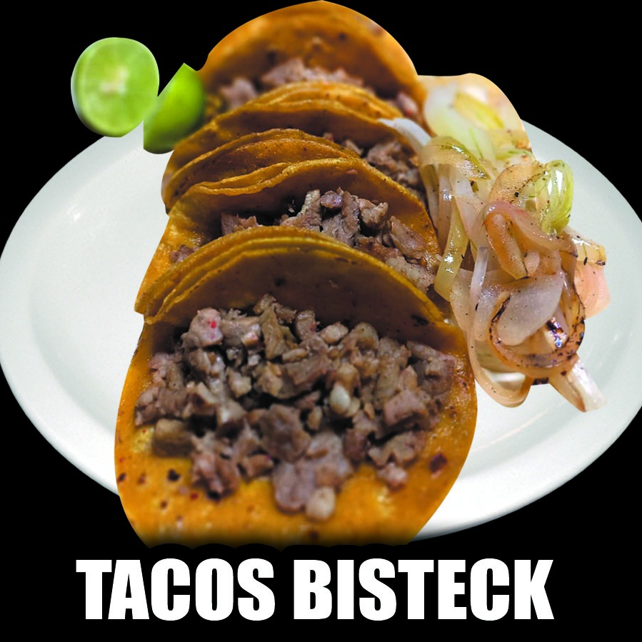 3 tortillas dobles con carne de bisteck y 2 tortillas dobles con carne de trompo con cebolla guisada, salsa roja, salsa verde, cebolla con cilantro y limones.