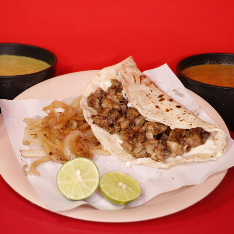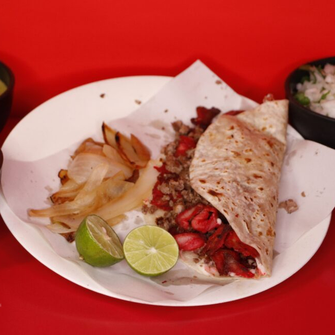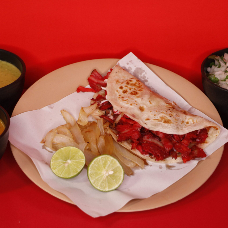 1 Tortilla de harina con queso asadero, trompo y bisteck, acompañado de cebolla, cilantro y salsas..