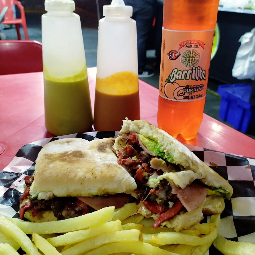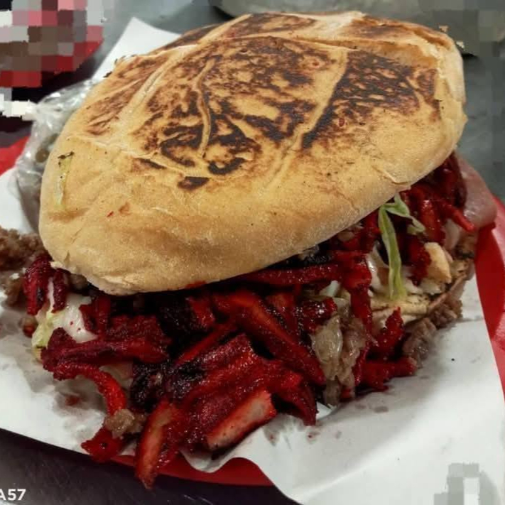 Torta con bistec, trompo, cebolla asada doble jamon doble queso y mucho mas