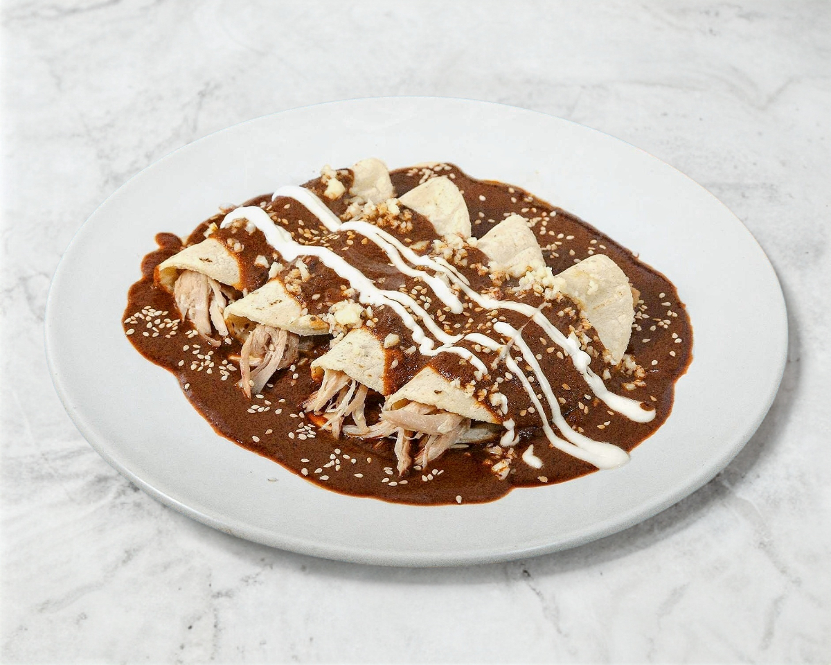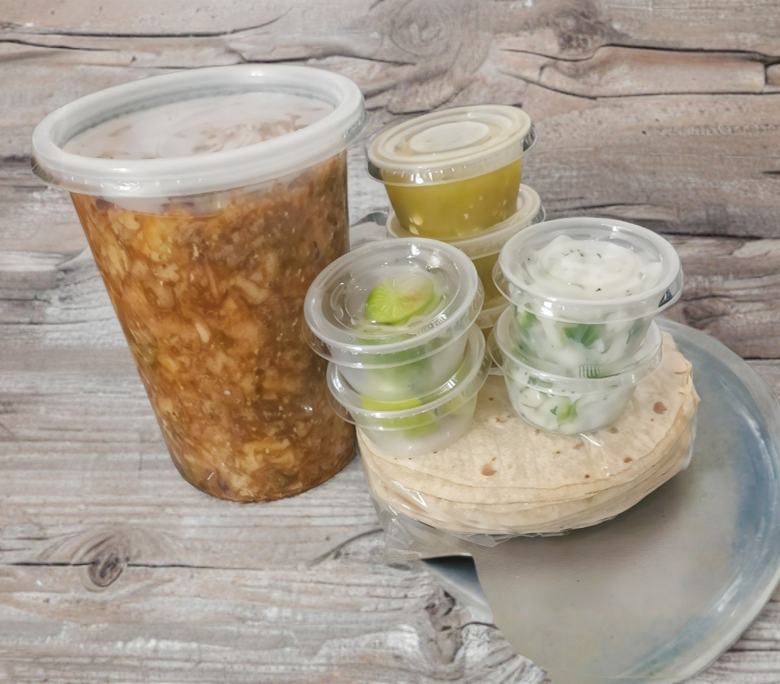 Salsa verde o roja, queso crema, pollo desmenuzado, frijol y los totopos. Para una persona